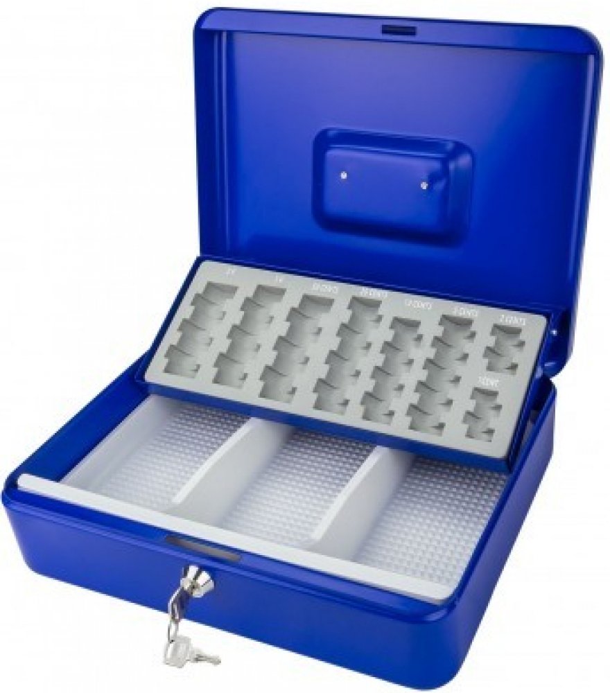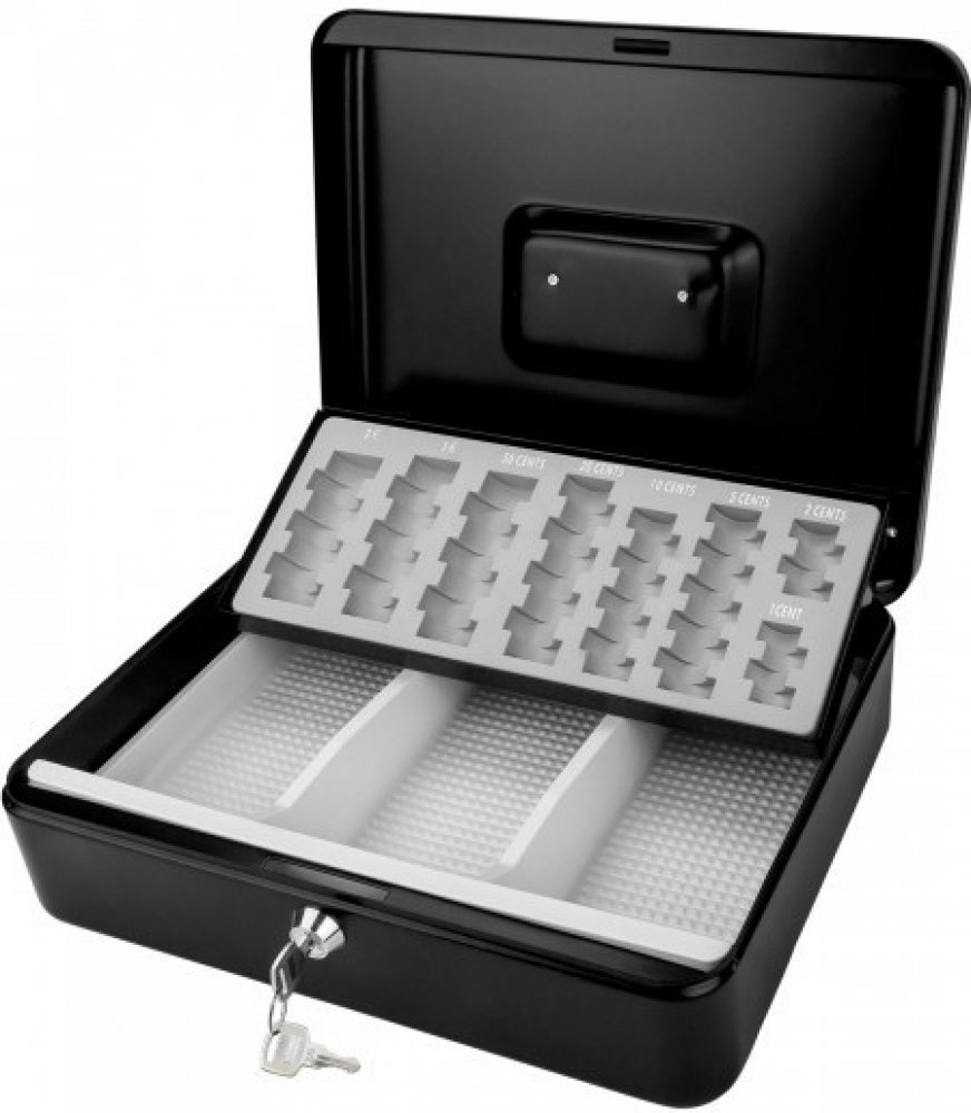 Uzamykatelná skříňka na peníze ideální do domácnosti, při různých akcích, jako trezor v prodejních stáncích a podobně. Kovová schránka potažená práškovou barvou, s praktickým sklápěcím držadlem a vyjímatelnou vložkou na mince z odolného PVC. Pod vložkou na peníze se nachází velká přihrádka. Dokonale zajištěna zámkem s válcovou vložkou se dvěma klíči. Zaoblené rohy.