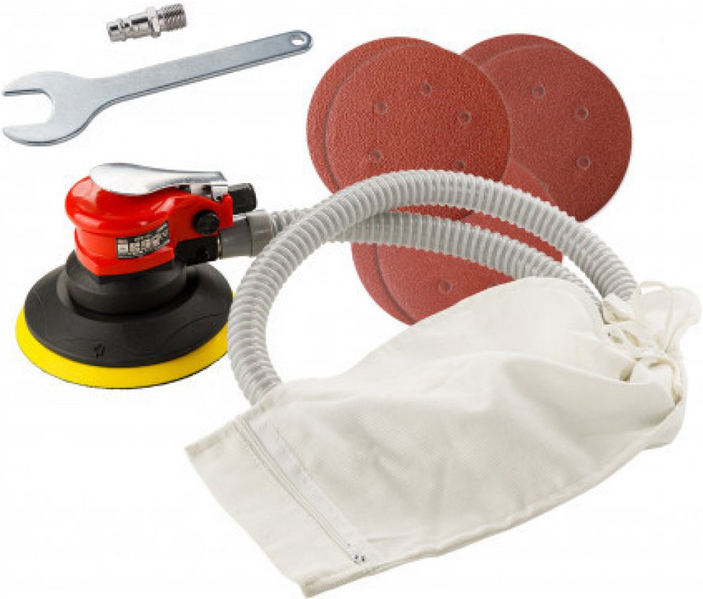 Lehká a praktická excentrická bruska s jednoduchou výměnou talíře s přiloženým klíčem, snadná výměna brusného papíru pomocí suchého zipu, ergonomické ovládání, integrované odsávání s kapsou na prach, možné připojení na externí vysavač. Včetně 6 brusných papírů.
