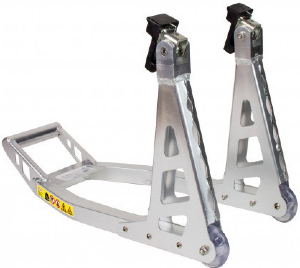 Stojan vhodný na rozměr předního kola motocyklu do 165 mm, s kvalitními kolečky s ABEC ložisky. Pracujte jako profesionálové a zjednodušte si práci na motocyklu se zvedákem, díky kterému zvednete motorku za pár sekund a můžete na ní provádět montážní a údržbové práce. Gumové úchyty rámu. Celohliníkové provedení. Ideální i na zazimování motorky.