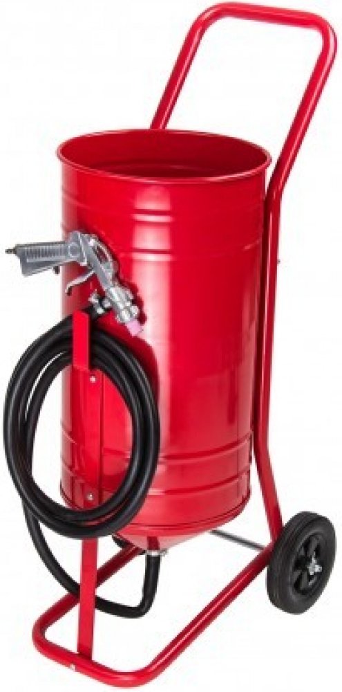 Pískovací přístroj na čištění a odstraňování rzi, zbytků barvy a podobně. Mobilní pískovačka s připojením na kompresor, pískovací materiál se nedopravuje vytvářením tlaku v nádobě, ale vytvářením podtlaku přímo v pistoli. Velká kola a madlo, velká nádrž na pískovací materiál.