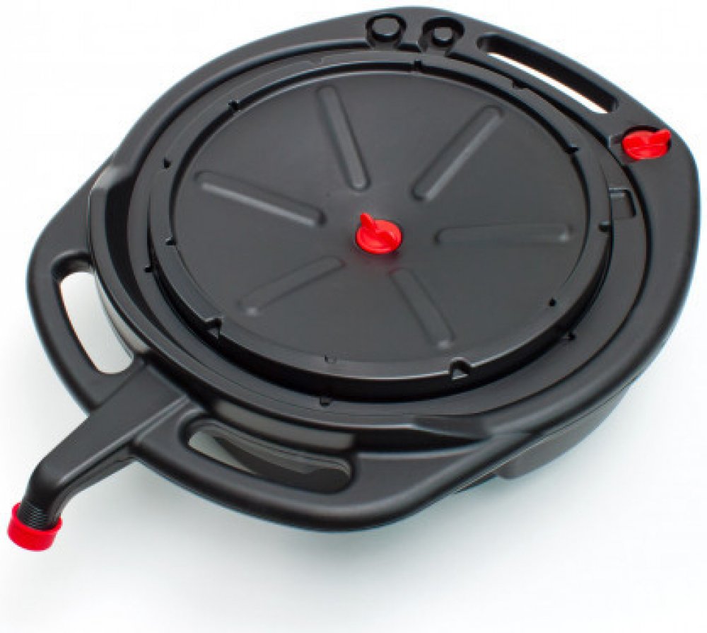 Sběrná nádoba pro výměnu oleje v lehkém plastovém provedení, plochý design i pro nízká vozidla a motocykly, velká plocha ve tvaru nálevky s odtokem uprostřed pro zachycení oleje, kvalitní těsnění, snadné vyprazdňování nádrže, 3 uzávěry s gumovým těsněním. Prohloubená drážka kolem oblasti nálevky pro olejovou vypouštěcí zátku.