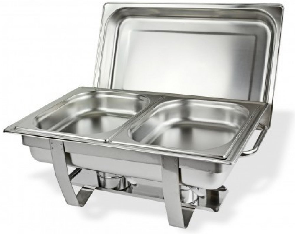 Ohřívač z ušlechtilé oceli se dvěma nádobami, určený na udržování teploty jídel, vhodný na party, rodinné oslavy, veletrhy apod. Dvě nádoby na jídlo, jedna velká vana na vodu, dvě uzavíratelné nádoby na hořlavou pastu, kryt, dvě rukojeti pro přenášení. Hořlavá pasta není součástí balení.