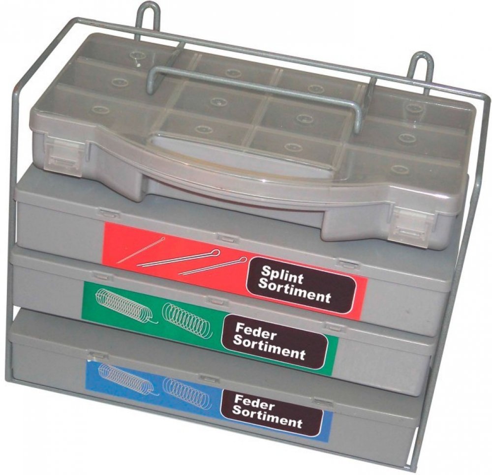 Sada obsahuje 600 různých pružin a 300 závlaček, uložené v praktickém organizéru s kovovým rámem s rukojetí, možnost upevnění na stěnu a s PVC přihrádkami. Tři plné a jedna prázdná při...