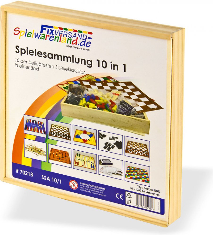 Sada 10 společenských her v dřevěném boxu. Stolní hry zaručují zábavu pro malé i velké. Souprava obsahuje Backgammon, Šachy, Čínské šachy, Domino, Dáma, Mikádo, Mlýn, Člověče nezlob se, Žebřík, hrací karty.