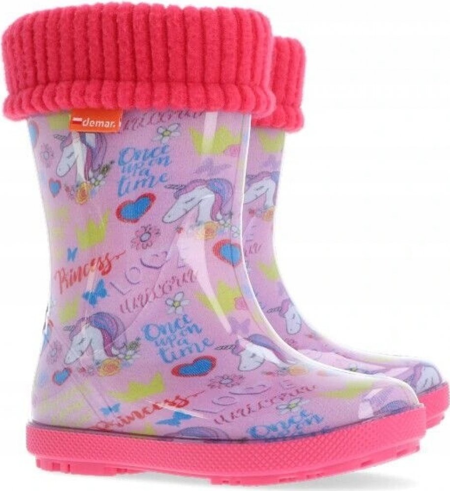 Dětské zateplené barevné holínky značky Demar z kvalitního a odolného materiálu PVC s motivem jednorožců. Vyjímatelné syntetické zateplení. Pohodlné a lehké.