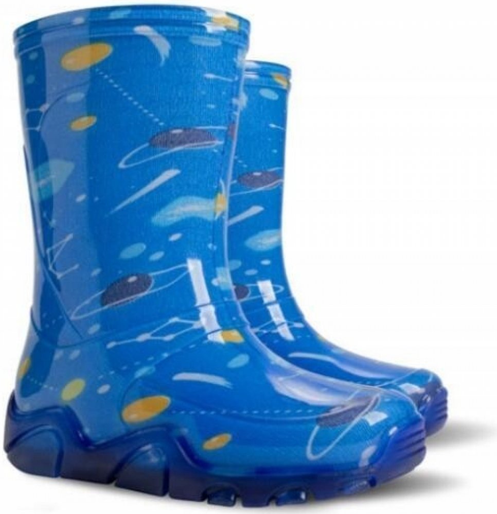 Dětské barevné holínky značky Demar z kvalitního a odolného materiálu PVC s motivem vesmíru. Podšité příjemnou textilií. Pohodlné a lehké.