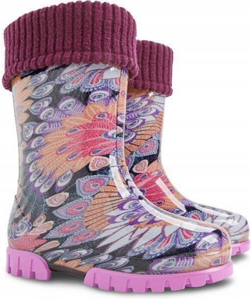 Dětské zateplené holínky TWISTER LUX PRINT M PAVÍ PERA od značky DEMAR. Obuv je vybavena reflexním prvkem a praktickou vyjímatelnou izolační vložkou. Holínky jsou perfektní na cestu do školy nebo na hrátky venku.