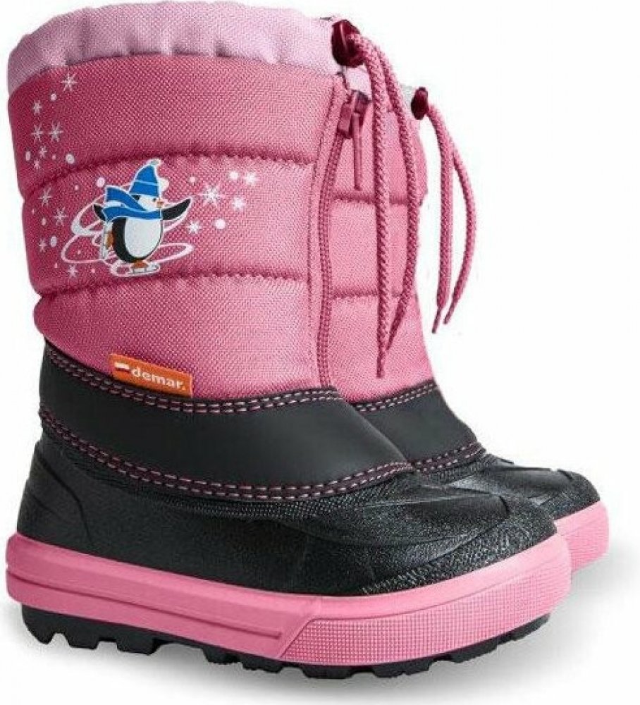 Dětské zimní stahovací sněhule Demar KENNY jsou výbornou volbou do chladného zimního počasí. Zateplení z pravé ovčí vlny zaručuje vysoký tepelný komfort. Růžový svršek obuvi je vyroben z odolné a lehce omyvatelné textilie. Nepromokavá spodní část sněhulí je z mrazuvzdorného termokaučuku. Obuv je proto vhodná jak do břečky, tak i do mrazivého počasí. Pro pohodlné nazouvání je na přední straně obuvi...