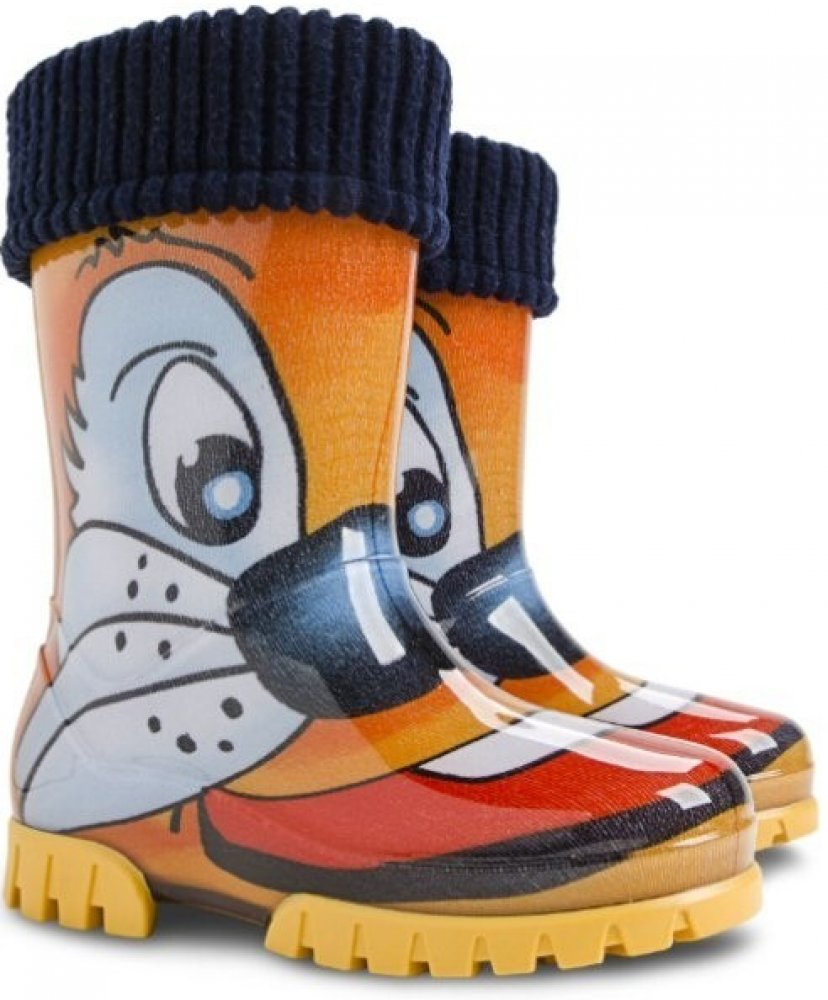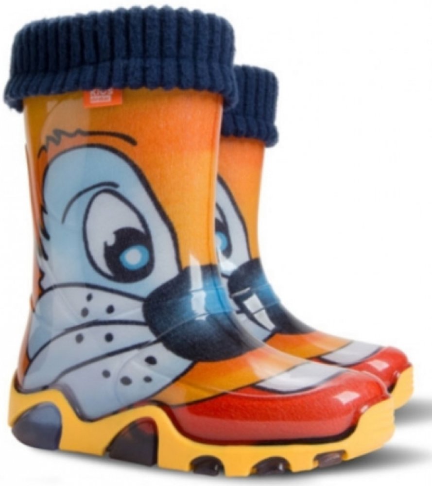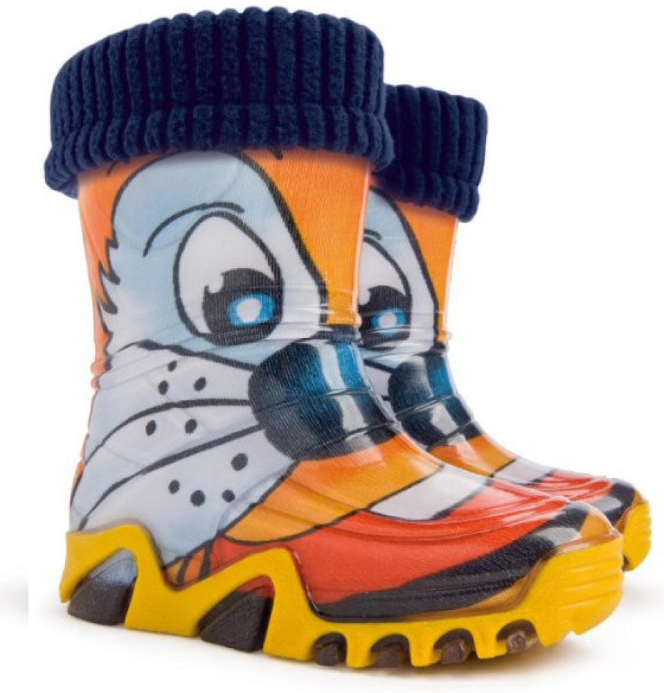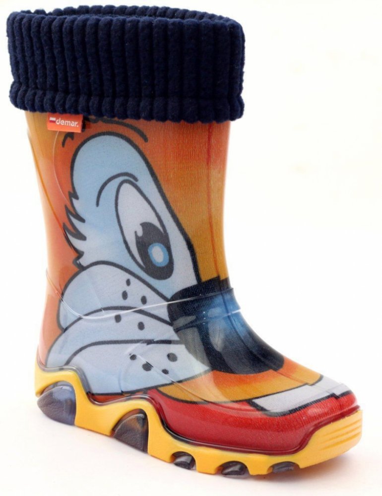 Dětské zateplené holínky demar STORMER LUX PRINT jsou ideální pro deštivé letní a podzimní počasí. Barva holínek je oranžová imitující kočku. Mají hrubší protiskluzovou podrážku zajišťující bezpečnost chůze. Holínka je velice pohodlná a lehká. Materiál je vysoce kvalitní a odolné PVC podšité příjemnou textilií. Na patě obuvi je bezpečnostní reflexní pásek pro dobrou viditelnost dí...