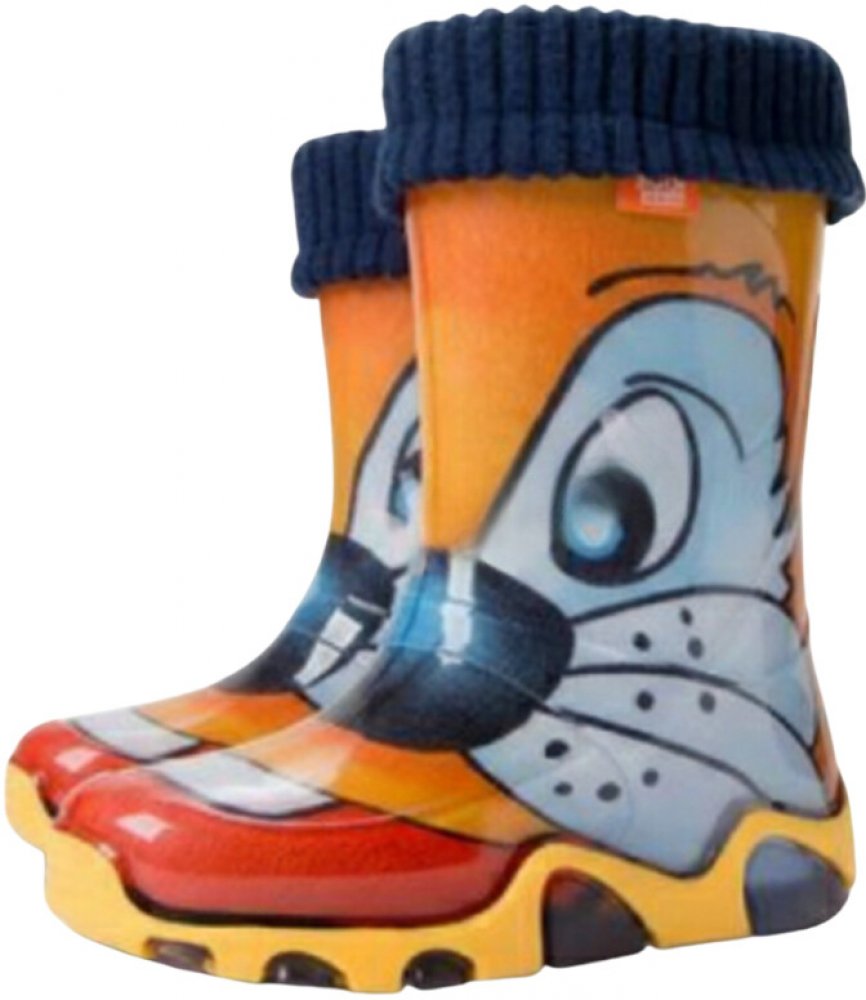 Dětské zateplené holínky demar STORMER LUX PRINT jsou ideální pro deštivé letní a podzimní počasí. Barva holínek je oranžová imitující kočku. Mají hrubší protiskluzovou podrážku zajišťující bezpečnost chůze. Holínka je velice pohodlná a lehká. Materiál je vysoce kvalitní a odolné PVC podšité příjemnou textilií. Na patě obuvi je bezpečnostní reflexní pásek pro dobrou viditelnost dítěte ve tmě.