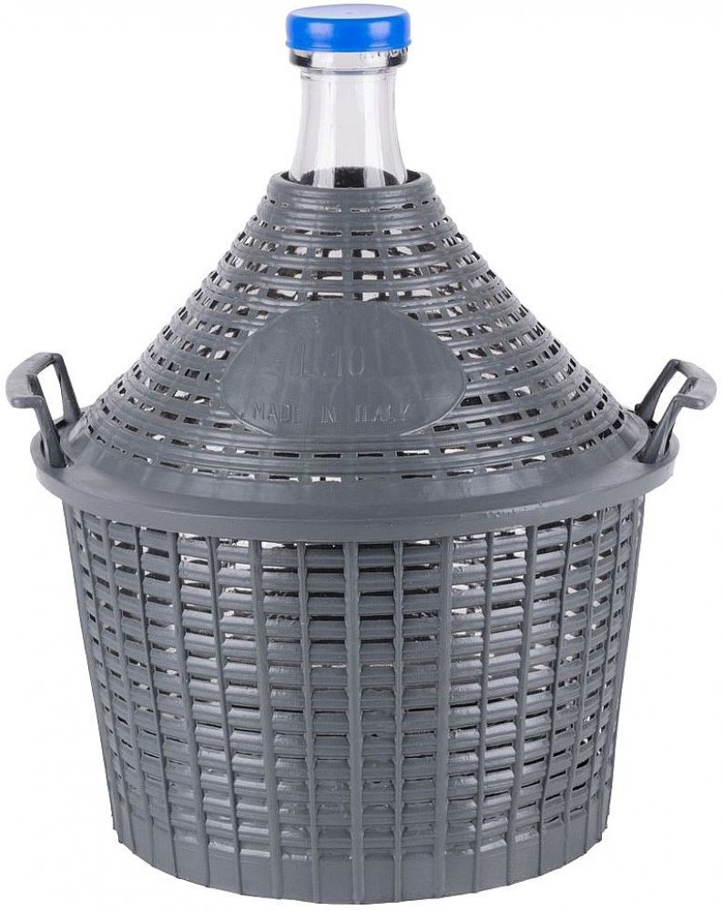 Demižon sklo v plastovém koši 10l Skleněny demižon o objemu 10 l v plastovém koši Objem: 10 l Rozměry: 400 x 340 x 245 mm Skleněný demižon v plastovém obalu se dvěma úchyty pro snadnější manipulaci. Používá se k uskladnění a převozu tekutin. Demižon je bez uzávěru, ten lze dokoupit.