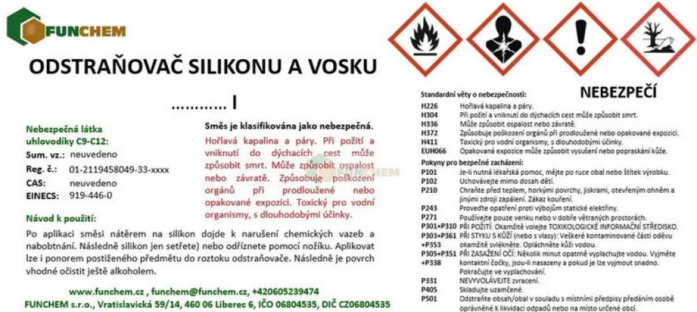 Upozornění:H226Hořlavá kapalina a páry.H314Způsobuje těžké poleptání kůže a poškození očí.H413Může vyvolat dlouhodobé škodlivé účinky pro vodní organismy.P101Je-li nutná lékařská pomoc, mějte po ruce obal nebo štítek výrobku.P102Uchovávejte mimo dosah dětí.P210Chraňte před teplem, horkými povrchy, jiskrami, otevřeným ohněm a jinými zdroji zapálení. Zákaz kouření.P260Nevdechujte prach/dým/plyn/mlhu/páry/aerosoly.P280Používejte ochranné rukavice/ochranný oděv/ochranné brýle/obličejový štít.P301+P330+P331PŘI POŽITÍ: Vypláchněte ústa. NEVYVOLÁVEJTE zvracení.P303+P361+P353PŘI STYKU S KŮŽÍ (nebo s vlasy): Veškeré kontaminované části oděvu okamžitě svlékněte. Opláchněte kůži vodou/osprchujte.P305+P351+P338PŘI ZASAŽENÍ OČÍ: Několik minut opatrně vyplachujte vodou. Vyjměte kontaktní čočky, jsou-li nasazeny a pokud je lze vyjmout snadno. Pokračujte ve vyplachování.P310Okamžitě volejte TOXIKOLOGICKÉ INFORMAČNÍ STŘEDISKO/lékaře/ tel. 224 919 293 nebo 224 915 402 (24 hodin denně)P370+P378V případě požáru: K hašení použijte dle bezpečnostního listu hasící přístroj/písek/oxid uhličitý.P501Odstraňte obsah/obal dle instrukcí na výrobku.