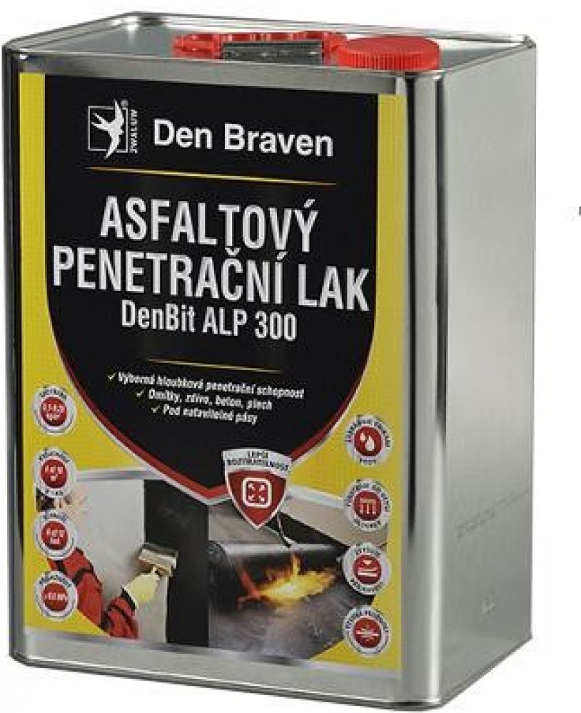 Den Braven Asfaltový penetrační lak DenBit ALP 300 9 kg Je elastická bitumenová hmota modifikovaná syntetickým kaučukem, obsahuje chemické přísady umožňující hlubokou penetraci a použití u mírně vlhkých podkladů. Nátěr je odolný vůči vodě, slabým kyselinám a zásadám. Vlastnosti Velice snadná roztíratelnost Rychleschnoucí nátěr Nízká spotřeba Okamžitě použitelný Zabraňuje vnikání vody Zvyšuje přilnavost asfaltových hydroizolací Výborná hloubková penetrační schopnost Odolný vůči slabým kyselinám a zásadám Na suchý i mírně vlhký podklad Zapáchá - nutné řádné větrán