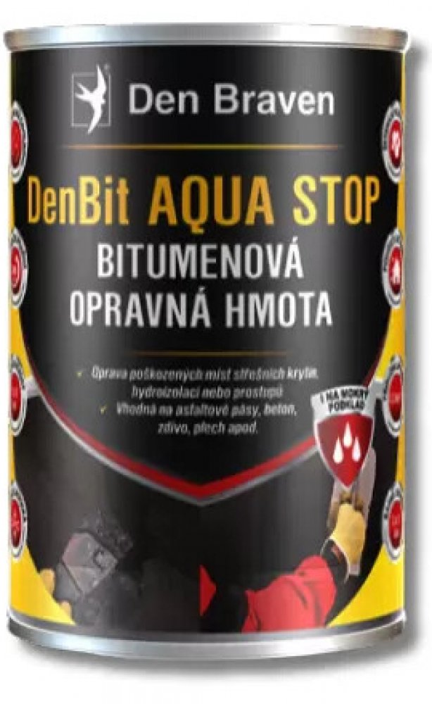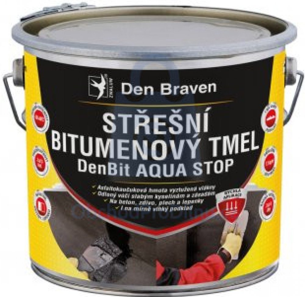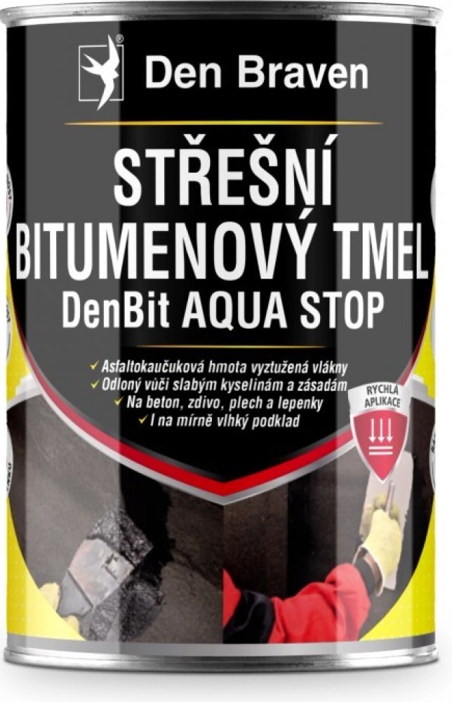 Střešní bitumenový tmel DenBit AQUA STOP Den Braven je hotová bitumenová pasta modifikovaná syntetickým kaučukem s přidanými vyztužujícími vlákny a chemickými přísadami. Díky obsaženým přísadám lze tmel použít na mokrý podklad, za deště i pod hladinou vody. Bitumenový tmel je elastoplastický a umožňuje nivelovat pohyby podkladu. Je možné jej použít v přímém kontaktu s polystyrenem. Použít ho lze n...