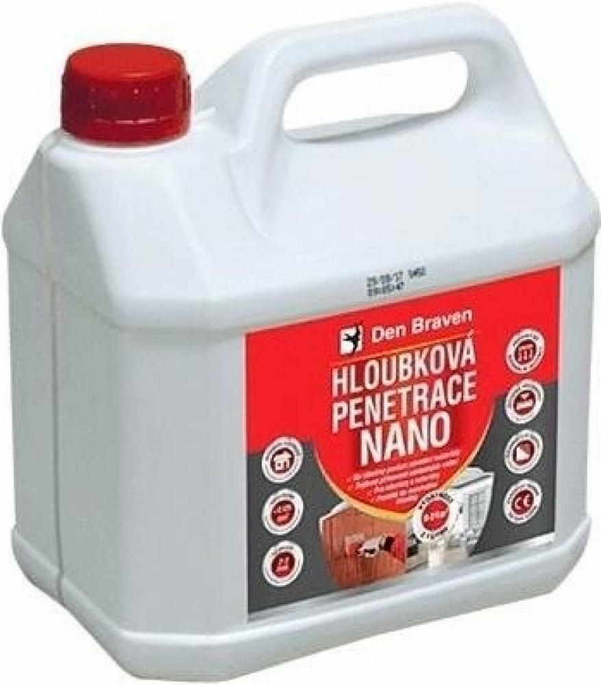 Hloubková penetrace Den Braven NANO je vodou ředitelná kapalina s nízkou viskozitou, vhodná pro domácnost i stavbu. Penetrace proniká do hloubky, zpevňuje podklad, zvyšuje jeho vodoodpudivost a zlepšuje přilnavost k následným vrstvám. Hodí se například na beton, omítky, zdiva, sádrokartonové desky nebo anhydrit. Vhodná je i pro sjednocení savosti a snížení nasákavosti podkladu před lepením obkladů a dlažeb, před vyrovnáváním podlah samonivelačními hmotami. Používá se i jako adhezní můstek pro další materiály, jako jsou vodou ředitelné nátěrové hmoty, lepidla, akrylátové fasádní nátěrové hmoty, syntetické omítkoviny, tmely a vyrovnávací či sanační hmoty na bázi polymerních disperzí. Po vytvrzení je penetrace nerozpustná ve vodě a je odolná alkalické hydrolýze. Penetrace vytváří bariérový efekt, který omezuje vzlínání rozpustných solí z podkladu. Přípravek je založen na bázi nano částic a styren-akrylátového kopolymeru pro dosažení maximální mechanické odolnosti podkladu....