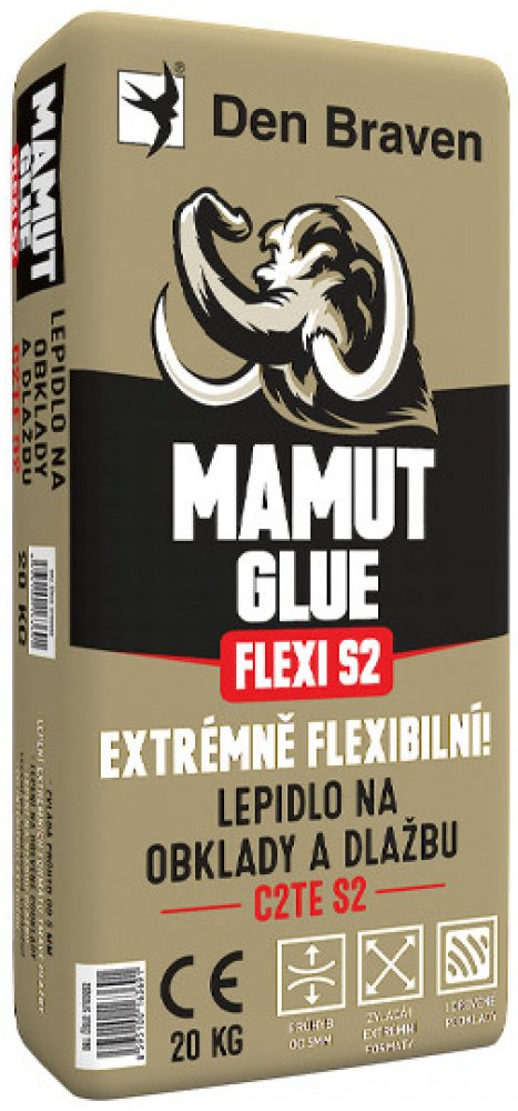 Lepidlo na obklady a dlažbu Den Braven MAMUT GLUE FLEXI C2TE S2 Vysoce deformovatelné cementové lepidlo se sníženým skluzem a prodlouženou dobou zavadnutí vyhovující náročnějším podmínkám. Určené pro lepení obkladů a dlažby, lepení tepelně izolačních materiálů a stěrkování armovací tkaniny. Lepení přímo na starou dlažbu, el. vytápěné rohože, velkoformátové prvky s vysokou mechanickou zátěží omítku beton, pórobeton, neomítnuté zdivo, apod. Použití - Lepení keramických obkladů a dlažby, dlažby z přírodního kamene na omítku beton, pórobeton, neomítnuté zdivo i na starou dlažbu - Do interiéru i exteriéru - Lepení dlažby na podlahové vytápění, pro přímou aplikaci na el. vytápěné rohože, starou dlažbu a obklady - Lepení velkoformátové a extrémní formáty a bezespáré obklady - Vynikající zpracovatelnost až 3 hodiny - Lze použít i pro stěrkování - Otevřený čas 30 minut - Také pro lepení na dřevěné podklady, OSB desky (nutno použít adhezní můstek) Podrobnější informace naleznete v technickém listu k dispozici ke stažení, v sekci ""Datové listy"".