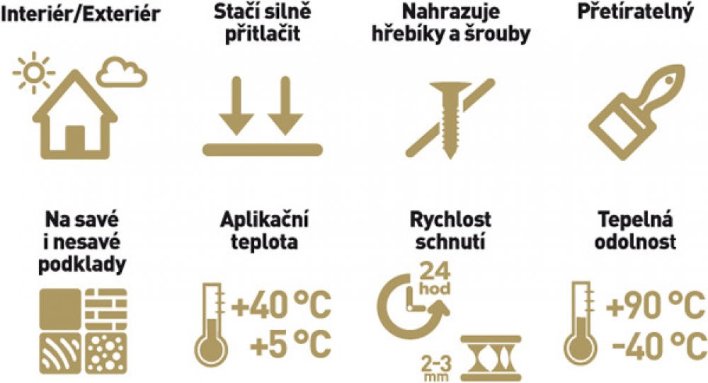 Pro mimořádně odolné lepené spoje již s maximální počáteční pevností. Přilepí i těžké předměty mamutí silou k podkladu, bez nutné fixace lepeného spoje. Pevnost v tahu po vytvrzení až 22 kg/cm². Nahrazuje hřebíky, šrouby a nýty. Jedná se o speciální modifikaci MS polymerů, vytvářející po vytvrzení přetíratelný vysokopevnostní a elastický spoj. Není agresívní k podkladům, je ideální pro lepení zrca...