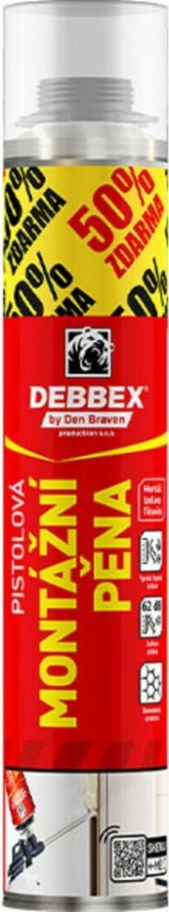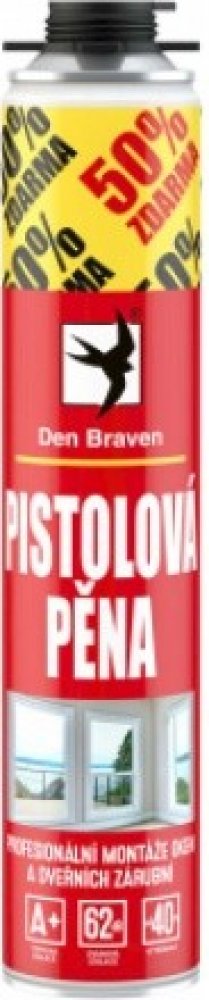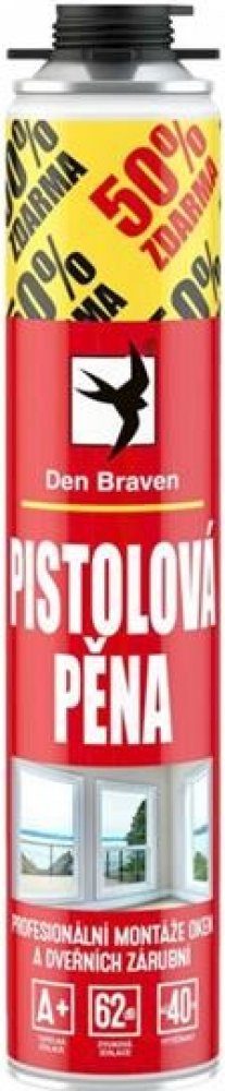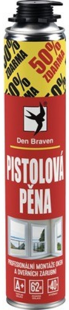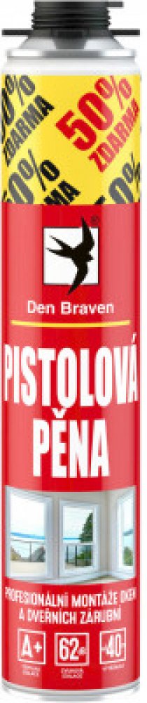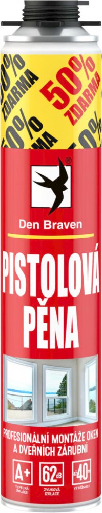 Montážní pěna PUR DEN BRAVEN pistolová je pěna v profi provedení pro přesnou a úspornou aplikaci pomocí aplikační pistole. Používá se k montáži dveřních zárubní a okenních rámů, vyplňování dutin, montážních prostorů mezi panely, zděnými příčkami, stropem a podlahou, dále i k vyplňování průchodů elektrického vedení. Jedná se o výbornou tepelnou izolaci půdních prostor nebo koupelnových van, je vhod...