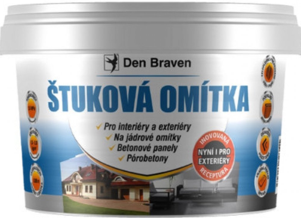 Štuková omítka DEN BRAVEN je již hotová namíchaná omítka připravená k okamžitému použití. Omítka je určená pro zhotovení finálních úprav zdí, pro opravy starých omítek nebo na povrchy jako je hladký beton a pórobeton. Při použití v méně náročných objektech může nahrazovat pro svou bělost i základní malířský nátěr.