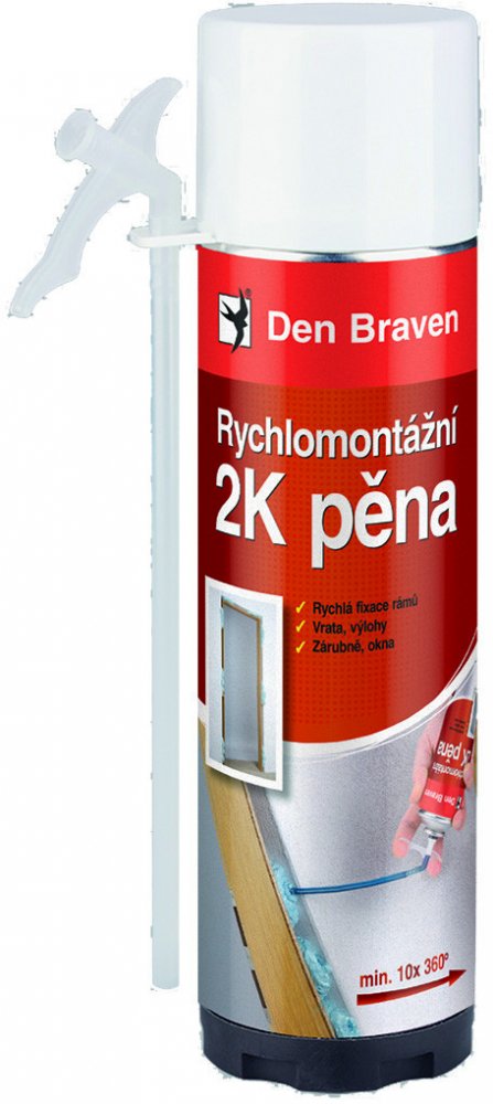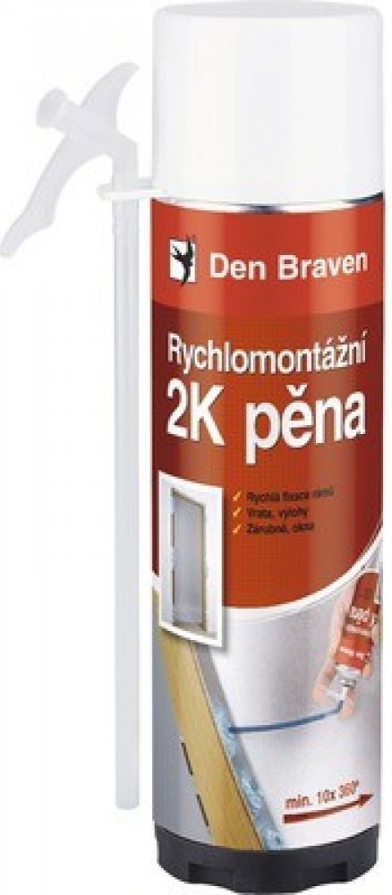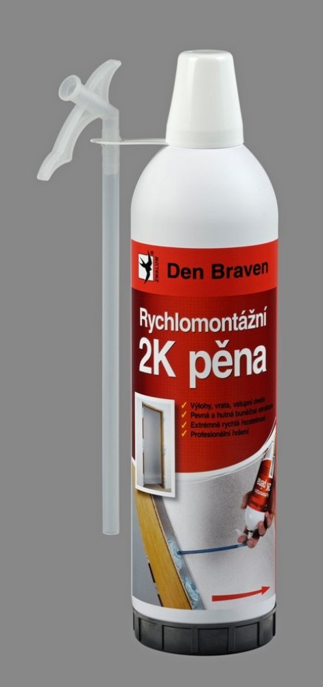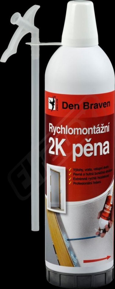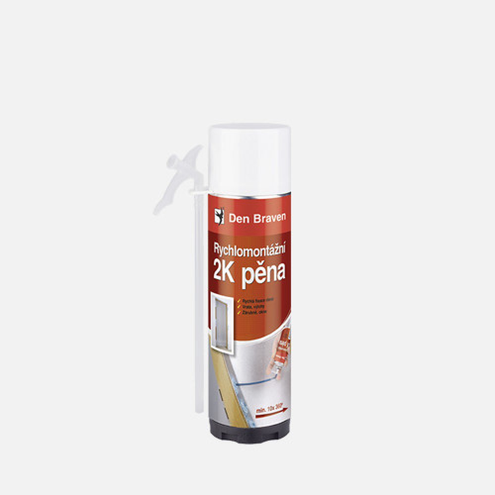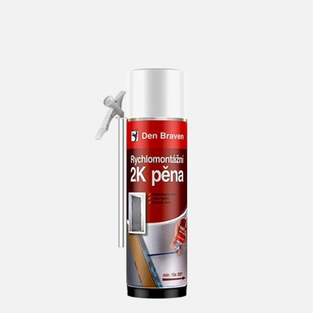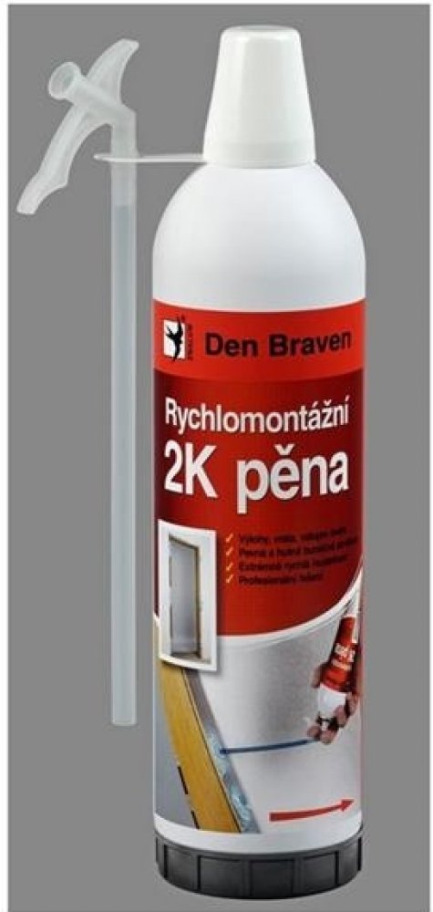 Den Braven Rychlomontážní 2K pěna je dvousložková montážní a konstrukční pěna na bázi chemicky vytvrzujícího polyuretanu. Tento produkt je navržen pro rychlé a efektivní montáže a vyplňování prostorů, kde je vyžadována vysoká pevnost a přilnavost. Díky svým vlastnostem je ideální pro použití v různých stavebních aplikacích, včetně montáže okenních rámů, dveřních zárubní a vyplňování průchodů elektrického vedení.