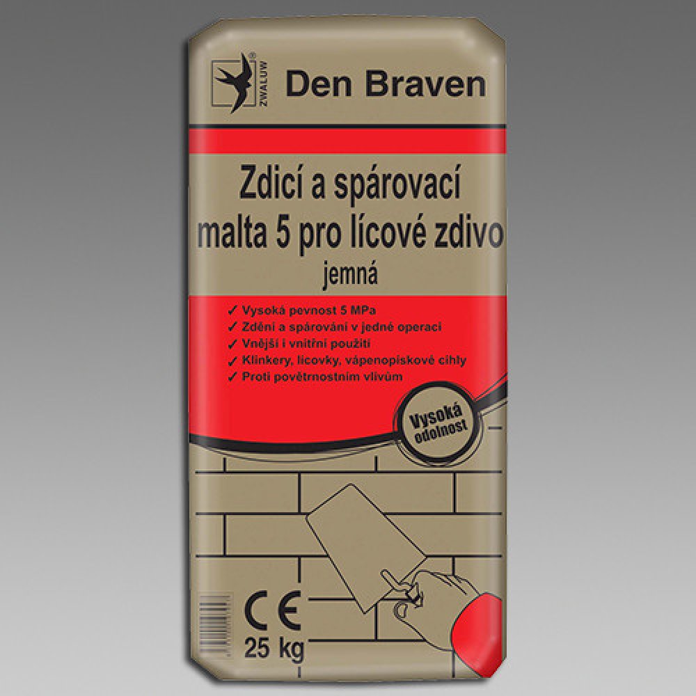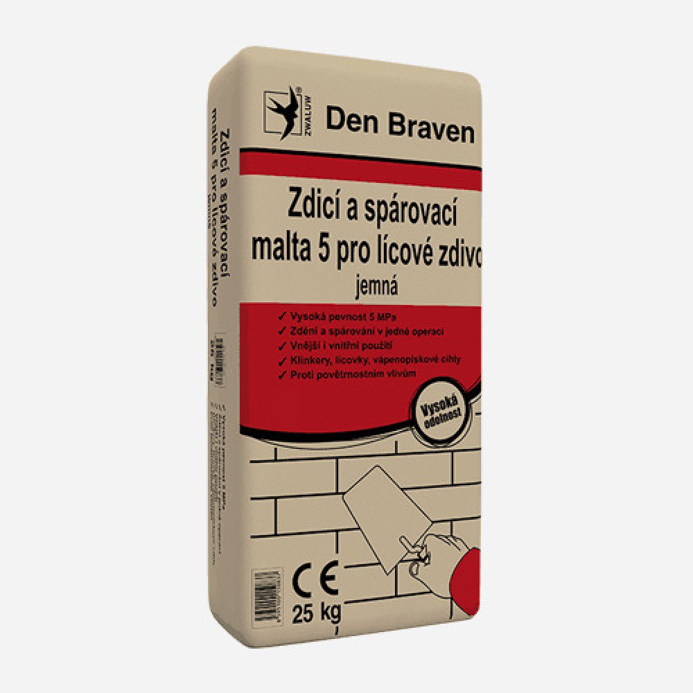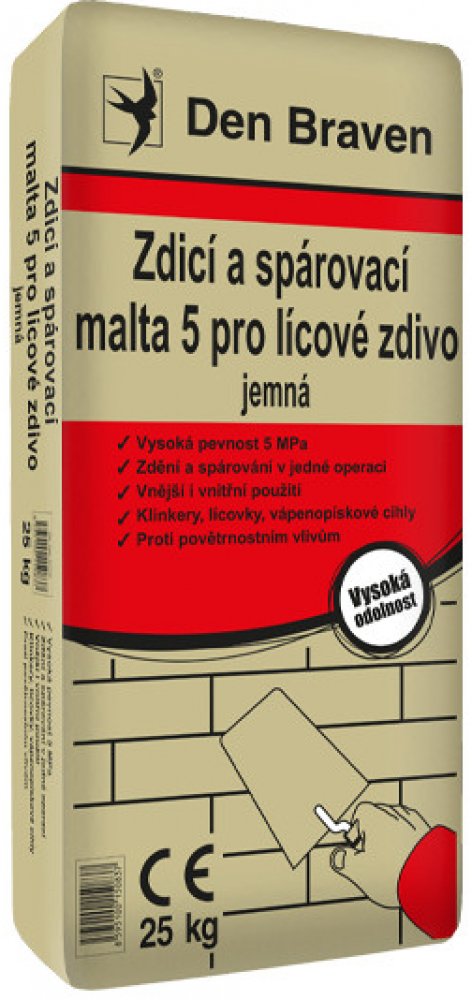 Zdicí a spárovací malta 5 pro lícové zdivo – průmyslově vyráběná suchá malta na bázi přírodních materiálů, ideální pro zdění a spárování lícového zdiva v jedné pracovní operaci. Hlavní výhody Vysoká pevnost 5 MPa Zdění a spárování v jedné operaci Vhodná pro vnější i vnitřní použití Ideální pro klinkery, lícovky, vápenopískové cihly Odolnost proti povětrnostním vlivům Jemnozrnná Použití Zdění a lep...