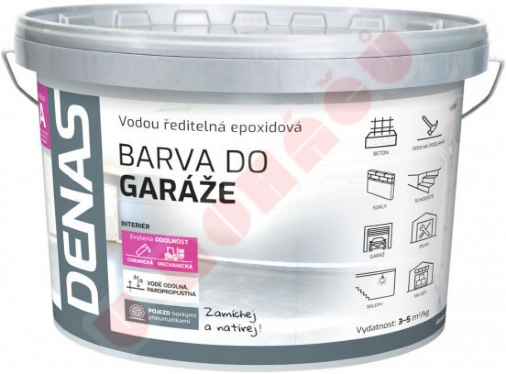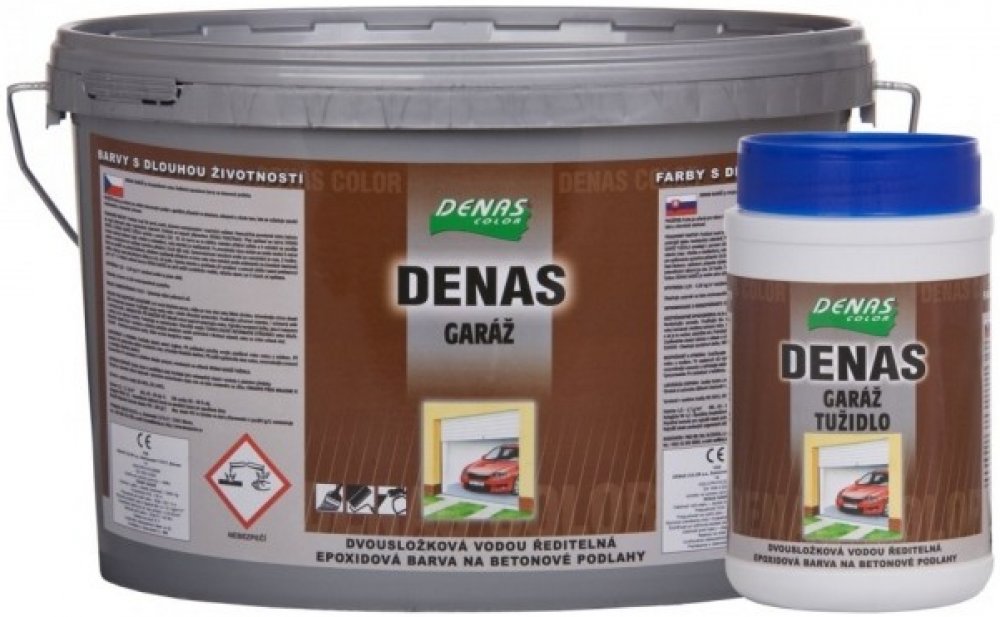 Dvousložková epoxidová barva na betonové podlahy. DENAS GARÁŽ je dvousložková vodou ředitelná epoxidová barva určená pro nátěry betonových podlah v garážích. Barva se vyznačuje vysokou mechanickou a chemickou odolnosti. Použití:Nátěry betonových podlah v garážích popřípadě skladech, sklepech a všude tam, kde se vyžaduje vysoká mechanická a chemická odolnost. DENAS GARÁŽ není vhodný jako konečný nátěr v exteriérech. Pracovní postup:Před aplikací se barva DENAS GARÁŽ a DENAS GARÁŽ TUŽIDLO smíchá v poměru 100:20. Do barvy se za stálého míchání přidává tužidlo a k míchání se použije vhodné míchací zařízení (např. vrtačka s míchadlem). Po promíchání obou složek se směs nechá 5 minut odstát a konzistenci pro aplikaci upravíme přidáním 10-20 dílů vody. Zpracovatelnost natužené směsi je max. 2 hod. Barva se nanáší na podklad štětcem, válečkem popřípadě stříkáním ve dvou nebo více vrstvách podle požadavků na konečné vlastnosti nátěru. Odstup mezi jednotlivými nátěry je min. 12 hodin. Teplota vzduchu a podkladu při nanášení a schnutí nátěru nesmí poklesnout pod +15°C. Podlahy natřené barvou DENAS GARÁŽ lze plně zatížit (umístěním vozidla, nábytku apod.) po 5 dnech od aplikace. Bezpečnost a hygiena: DENAS GARÁŽ je klasifikováno jako Xi - dráždivý , vážné nebezpečí poškození očí. DENAS GARÁŽ TUŽIDLO obsahuje epoxidové složky a je klasifikovan jako Xi – dráždivý, N – nebezpečný pro životní prostředí, dráždí oči a kůži, může vyvolat senzibilizaci při styku s kůží a je toxický pro vodní organizmy, může vyvolat dlouhodobé nepříznivé účinky ve vodním prostředí. Při práci s tužidlem a natuženou barvou dodržujte bezpečnostní pokyny uvedené v bezpečnostním listu DENAS GARÁŽ TUŽIDLO. Při práci používejte ochranné pomůcky a dodržujte zásady osobní hygieny. Při aplikaci stříkáním chraňte dýchací orgány, v uzavřených prostorách zajistěte větrání pracoviště. Při potřísnění pokožky omyjte postižené místo vodou a mýdlem. Při zasažení očí vypláchněte důkladně velkým množstvím čisté vody a vyhledejte lékařské ošetření. Při požití vypláchněte ústa vodou, nevyvolávejte zvracení a vyhledejte lékařské ošetření. Doporučený způsob aplikace:štětcem, válečkem, stříkáním Vydatnost a doporučené tloušťky:Teoretická spotřeba je 0,2 – 0,35 kg/m² natužené směsi na jeden nátěr při optimální tloušťce 50 µm na jednu vrstvu, pro penetraci 0,1 až 0,15 kg/m² natužené směsi. Tužení: DENAS GARÁŽ a DENAS GARÁŽ TUŽIDLO smísí v poměru 100 : 20. Do barvy se vždy přidává za stálého míchání tužidlo. K míchání se používá vhodné míchací zařízení (např. vrtačka s míchadlem), ruční míchání směsi je nepřípustné. Po dokonalém promíchání obou složek se směs nechá 5 min odstát a konzistenci pro aplikaci upravíme přidáním 10-20 dílů vody. Zpracovatelnost natužené směsi je min. 2 hod.