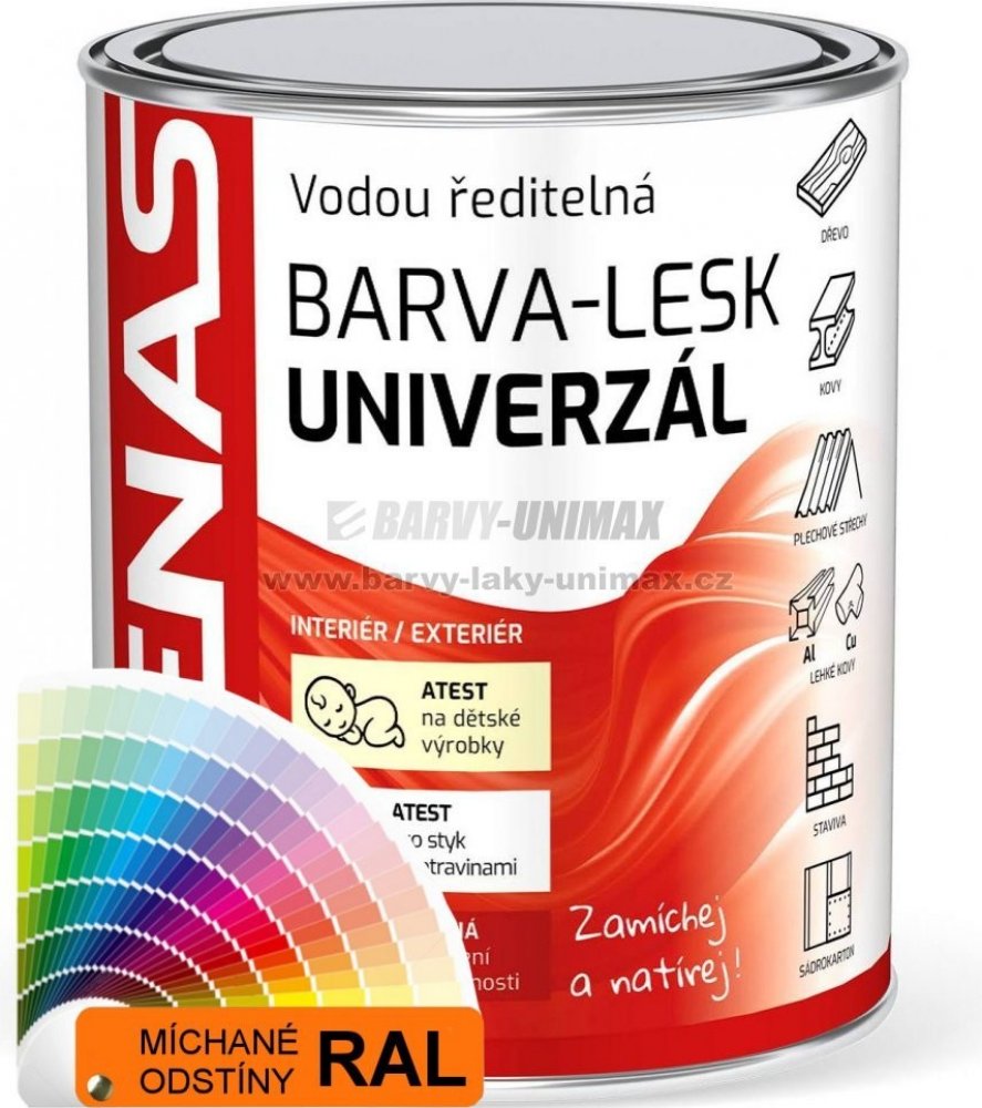 Podrobnosti o produktu DENUL10234 4 kg DENAS UNIVERZÁL LESK je vrchní vodou ředitelná barva na nátěry stavebních prvků a konstrukcí ze dřeva, kovu, staviv, pozinkovaného plechu i pozinkovaných střešních šablon, hliníku, některých druhů plastů, sádrokartonu. Nátěry mají vynikající odolnost, nekřídují, ani nekřehnou vlivem působení UV záření a povětrnosti, jsou odolné působení čisticích přípravků už...