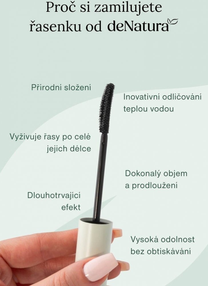 Řasenka nové generace obohacená o výtažky ze séra na řasy pro objem jako nikdy předtím v kombinaci s prodlužujícím efektem. Naše voděodolná řasenka s černým pigmentem vám kromě dokonalého objemu dodá i to, co má zatím velice málo řasenek – a to i kys. hyaluronovou, vitamíny, minerály a biotin, na základě kterého se dočkáte růstu řas jako nikdy předtím! Řasenka deNatura totiž obsahuje několik surovin z našeho skvělého séra na řasy. Řasenku doporučujeme užívat současně se sérem na řasy deNatura.