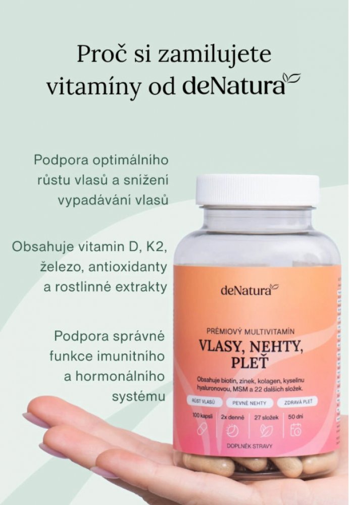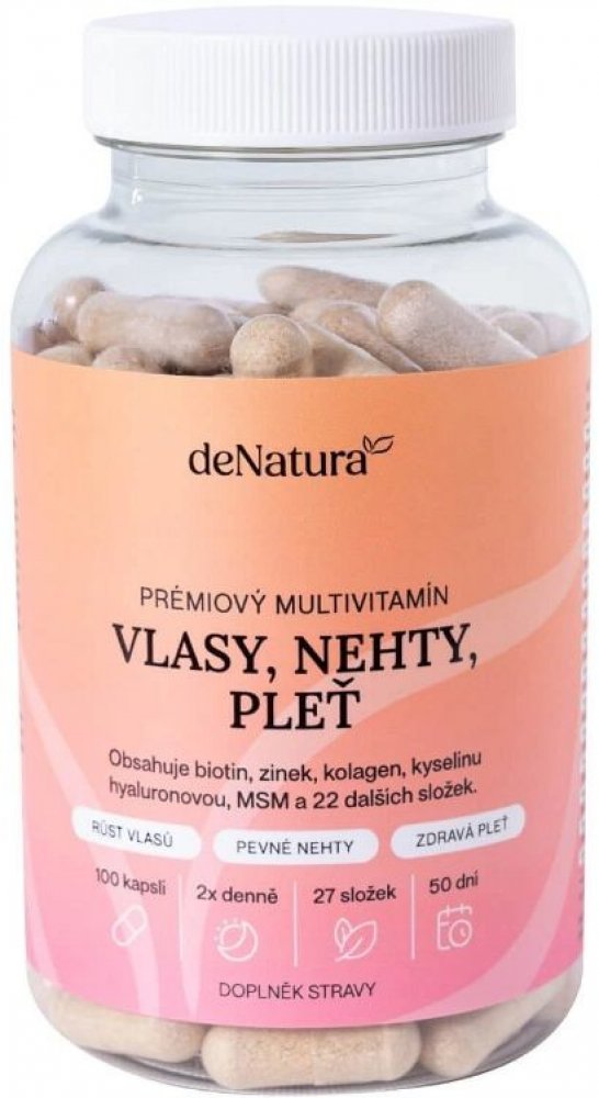 deNatura 100 tbl kapsle vlasy, nehty, pleť unisex deNatura pro dospělé perorální bez příchutě Česká republika multivitamínové komplexy vlasy, kůže a nehty s postupným uvolňováním 50 Kdykoliv 2 za den Suché místo + pokojová teplota, Chránit před světlem/sluncem, Mimo dos