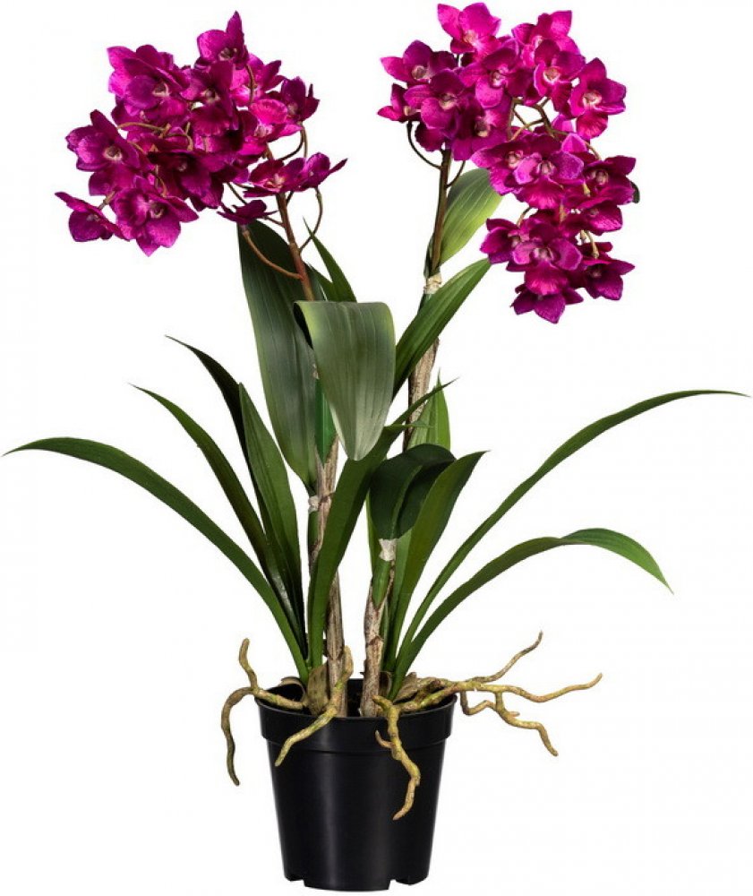 Okrasná umělá orchidej Dendrobie hustě osázená půvabnými fialovými květy. Výška umělé květiny včetně květináče je 61cm. Květy jsou v různých stádiích květenství. Orchidej má dále v podrostu propracované zelené listy. Celá květina je zasazena do plasového květináče. Na pohled a dokonce i na dotek je umělá orchidej k nerozeznání od živé květiny.
