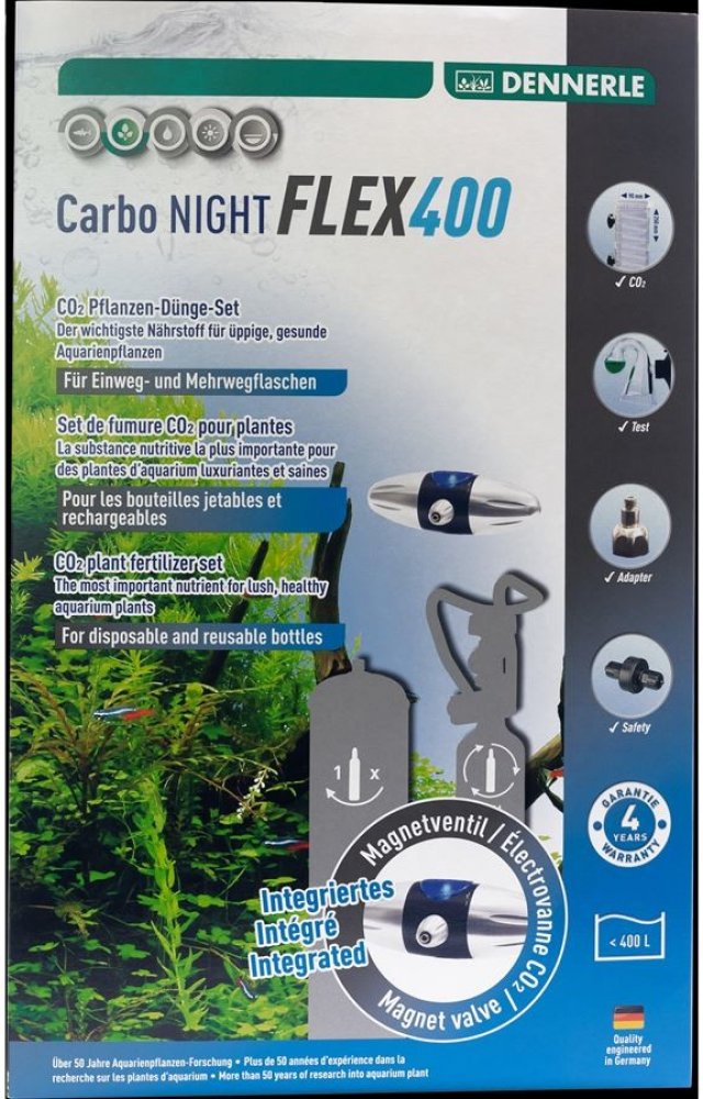 PRO AKVÁRIA DO 400 LITRŮ CARBO NIGHT FLEX400 Kompletní sada obsahuje: Přesný redukční ventil CO 2 Carbo Night s integrovaným nočním uzavíracím magnetickým ventilem Adaptér pro opakovaně použitelné lahve s CO 2 Speciální zpětný ventil CO 2 Speciální hadice CO 2 , 2 m Difuzor CO 2 s integrovaným počítadlem bublin a odvětráváním odpadního plynu CO 2 dlouhodobý test ze skla Maxi Crystal