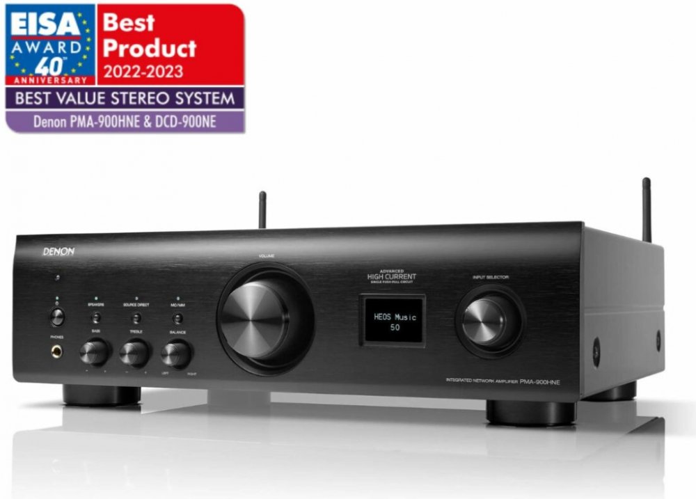 "Denon PMA-900HNE je ideální volbou pro milovníky hudby, kteří budují cenově dostupný systém s širokou funkční výbavou a výkonným zvukem. Osvědčená firemní technologie Advanced High Current se stará o servis spolupracujícím reprosoustavám a – poprvé u integrovaného zesilovače Denon – bezdrátové streamování HEOS a aplikace rozšiřují nabídku připojení, která zahrnuje také Bluetooth a sluchátkový výstup. PMA-900HNE lze používat také s gramofonem nebo televizorem, přičemž druhý jmenovaný se dokáže naučit příkazy dálkového ovladače. Pokud si jej pořídíte se stejně cenově dostupným CD přehrávačem Denon DCD-900NE, získáte skvělý systém ve dvou šasi, který pokryje všechny možnosti."