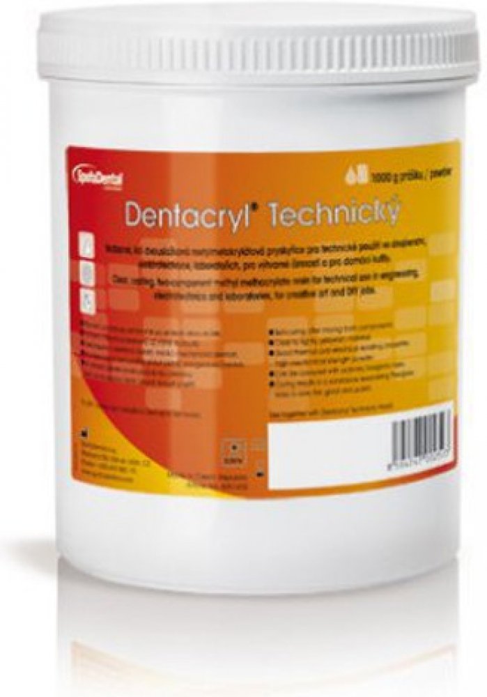 Dentacryl (vyhledávaný jako dentakryl) se vyrábí v balení jako prášek a tekutina. Polymeruje samovolně tzv. chemickou iniciací, kdy po smísení a vytvrzení obou složek vznikne bezbarvá až mírně nažloutlá hmota podobná plexisklu, která se dá snadno řezat, pilovat, brousit a leštit. Možnosti použití: - strojírenství - zalévání vodících desek razníků - metalurgické laboratoře – upevňování výbrusů - domácnosti - opravy příborů, držadel na různé nástroje, zalévání trhlin v xylolitových podlahách - modelářství - stavební modely železnic, letadel, lodí - pro sportovní účely - opravy lyží (hrany), opravy lodí, laminátových výrobků - pro motoristy - spojování prasklých štítů z organického skla, oprava různých tlačítek - ostatní - výroba broží, samolepek, ozdob, originálních korálků, rámečků na fotografie apod.Vlastnosti a výhody:- odolnost proti působení kyselin, zásad a solí- dobré elektrické vlastnosti (elektrická pevnost)- odolnost proti výkyvům teplot (dobra tepelná izolace)- vynikající mechanická pevnost- pevnost v tahu, tlaku a ohybu (jako u výplňových materialů)- snadná zpracovatelnostBalení:- 1000 g bezbarvého prášku (4351200) samostatněDalší varianty balení:- 930 g tekutiny (4353200) samostatně- 100 g prášku a 100 g tekutiny (4351100) sada 200 gOdkazy na tipy, rady, inspirace:http://jio-faq.blogspot.com/2007/07/odlvn-lukopren-x-dentacryl.htmlhttp://www.rcweb.cz/aktual/figurky.htmhttps://www.modelforum.cz/viewtopic.php?f=19&t=20592
