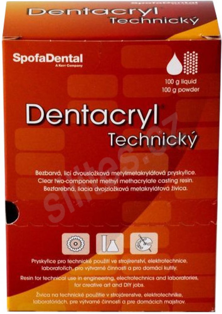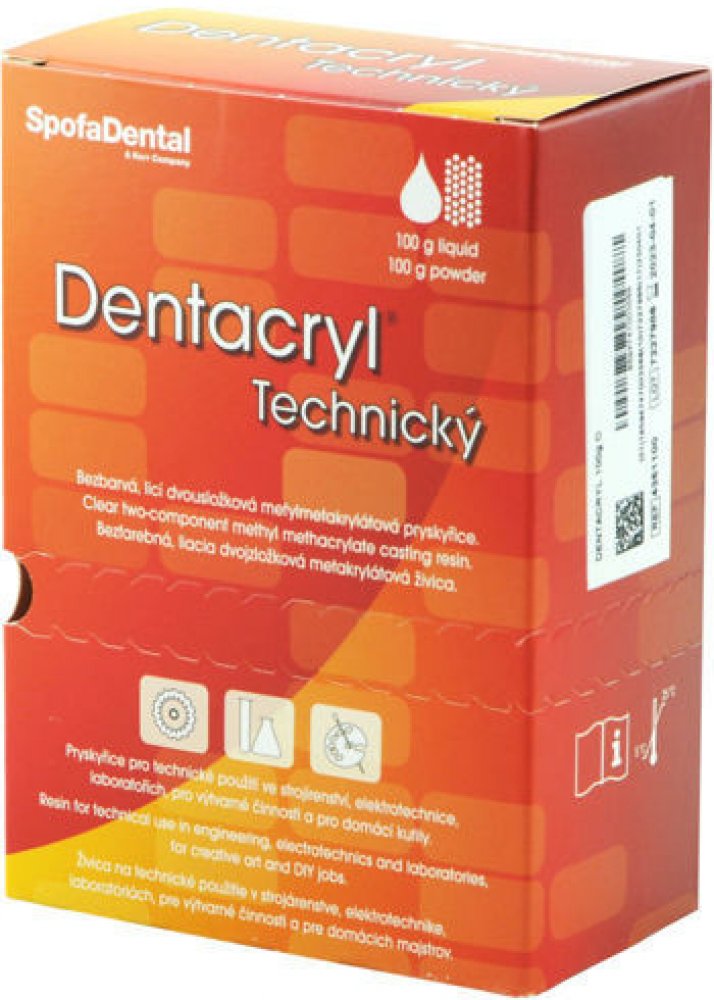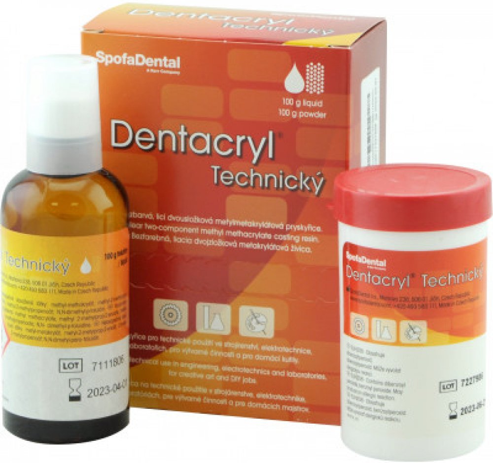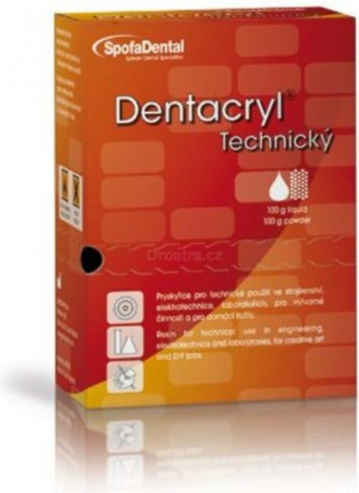 Použití:Snadná zpracovatelnost pryskyřice DENTACRYL® umožňuje jeho široké použití i v různých průmyslových oborech. Svými vlastnostmi je předurčen k využití v elektroprůmyslu. Ve strojírenství se uplatňuje např. při zalévání vodících desek razníků. Používá se k upevňování výbrusů v metalurgických laboratořích. Při odlévání většího množství přesahující 1 000 g zpracovaného materiálu je výhodné, odlévat předmět po částech, přičemž zůstanou jeho mechanické vlastnosti zachovány.