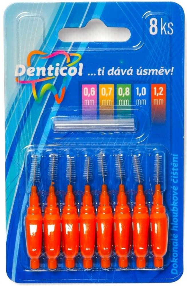 Péče o zuby je klíčovým prvkem v rámci každodenní hygieny. Mezizubní kartáček DENTICOL je tou správnou volbou pro čištění těch oblastí mezi zuby, kde se stále drží zbytky jídla. Jeho velikost dle ISO odpovídá 3 (1,1–1,2 mm). Je oblíbený pro skvělé čisticí schopnosti a možnost čistit také implantáty a ortodontické aparátky. Sada obsahuje 8 mezizubních kartáčků o velikosti 1,2 mm, které dobře dosáhnou i do zadních mezizubních prostor. Kompaktní kartáček napomáhá dostat se do míst se špatnou dostupností. Využijete ho i při cestování. Barevné varianty kartáčku vám usnadní určení jeho velikosti. Klíčové vlastnosti mezizubního kartáčku s plochou rukojetí DENTICOL P01, vel. 1,2 mm, 8 ksPlochá rukojeť pro pevný a pohodlný úchop a přesné čištěníKompaktní provedeníVysoce odolný proti zlomeníVhodné také pro fixní rovnátkaDlouhá životnostSpeciálně navržená vlákna pro efektivní čistěníKónický tvar vláken pro šetrnou aplikaciPlastová hygienická krytkaDle ISO norem odpovídá velikosti 3 (1,1–1,2...