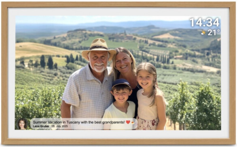 Set photo rotation intervals, add captions, manage friends, and schedule auto-off at night – all from the touchscreen.