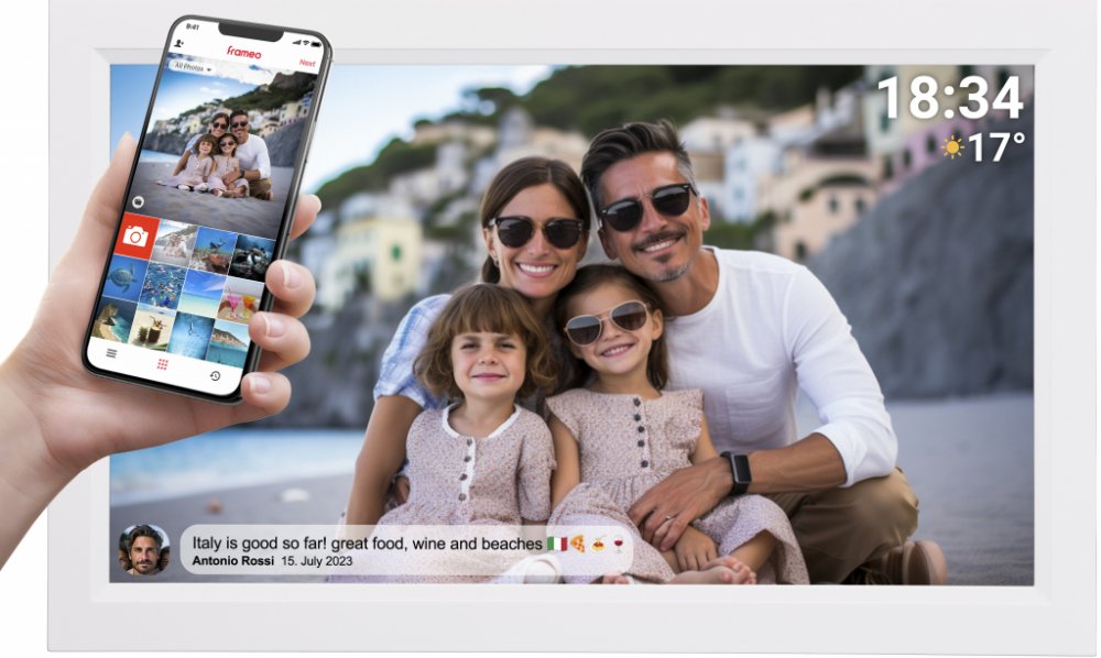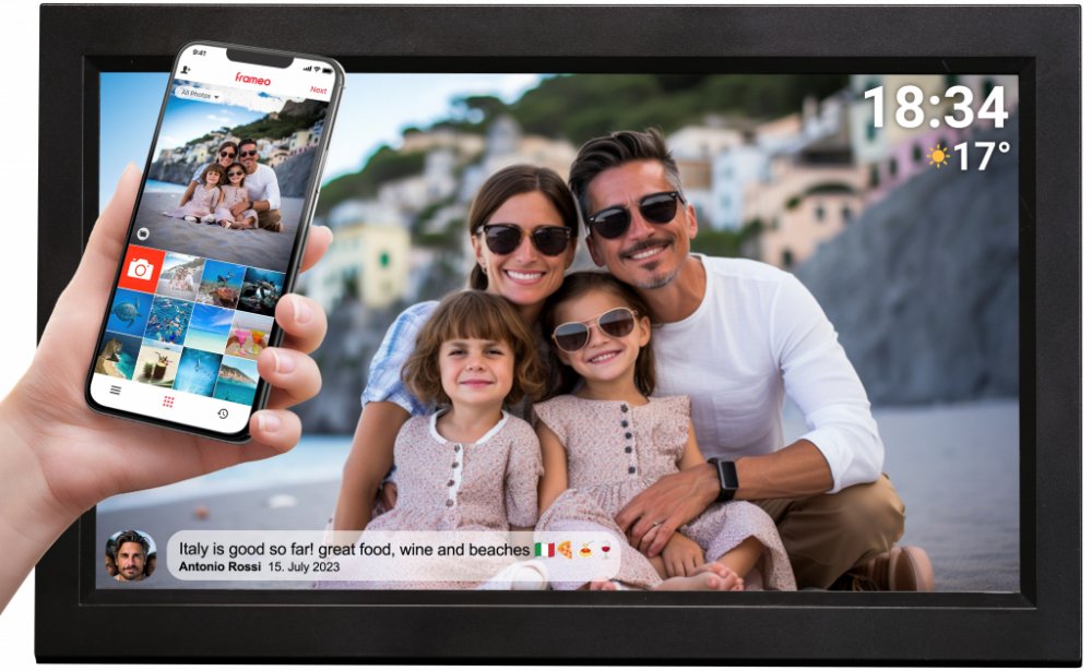 Denver PFF-1503 je digitální fotorámeček WLAN s úhlopříčkou 39,6 cm (15,6 palce) a fotografickým softwarem FRAMEO. Jedná se o nový sociální způsob sdílení fotografií a videí s přáteli a rodinou. Dotykový displej IPS poskytuje dobré a ostré snímky. Nejdůležitější informace:Inteligentní 39,6cm (15,6palcový) digitální fotorámeček WLANDotykový displej IPS s rozlišením 1920 x 1080 bodů a rozlišením Full HDvnitřní paměť 16 GB a slot na kartu microSD pro import snímkůPředinstalovaný software FRAMEOStáhněte si aplikaci do svého chytrého telefonu a poté přeneste fotografie a videa do fotorámečku FRAMEONechte stovky přátel nahrávat fotografie a videa přímo do fotorámečkuPřidávejte k obrázkům textNastavte dobu otáčení snímků v rozmezí 10 sekund až 30 minutFunkce časovače pro automatické vypnutí fotorámečku FRAMEO v noci Rozsah dodávky:Denver PFF-1503 FRAMEO fotorámečekNapájecí jednotka