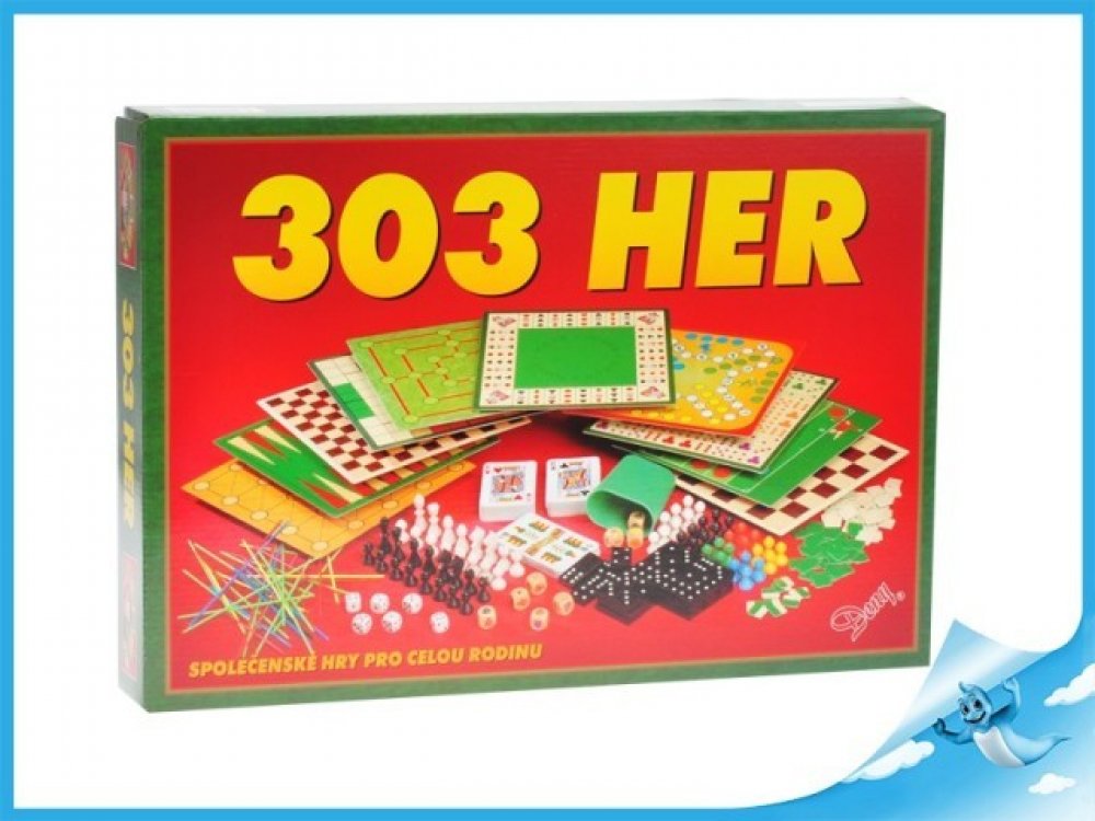 Tato společenská hra zpříjemní nejen dlouhé večery, ale rozhodně přinese spoustu zábavy během celého roku. Soubor her obsahuje 303 různých her uložených v krabici. Najdeme zde deskové hry jako např. člověče nezlob se, šachy, dáma, mlýn a spoustu dalších. Sada obsahuje i karty, kostky, domino, kartičky, mikádo a spoustu figurek a kamenů s kterými zažijete spoustu zábavy.