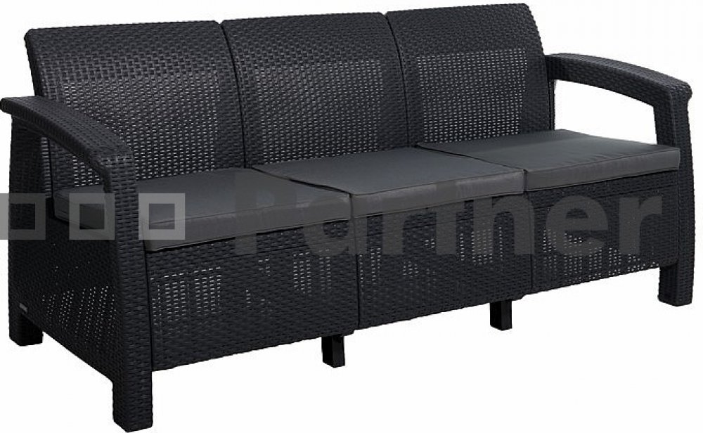 Dodáváno v demontovaném stavu Výška celkem: 790, Výška sedací části: 400/460, Šířka celkem: 1820, Hloubka celkem: 700, Hmotnost: 18, Nosnost: 220, Materiál: polypropylen, Barva: antracit, Stohovatelnost: ne, Možnost složení: ne, Poduška: ano (šedá), Balení: 1200 x 800 x 420