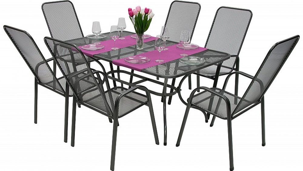 Elegantní kovová sestava Sandra nabízí 2 varianty obdélníkových stolů bez otvoru na slunečník (rozměry 160 × 95 nebo 190 × 105 cm) a 6 stohovatelných křesel s nosností 120 kg. Je prakticky univerzální – vybaví zahrady, terasy, zahrádky restaurací i rozmanité vnitřní prostory.