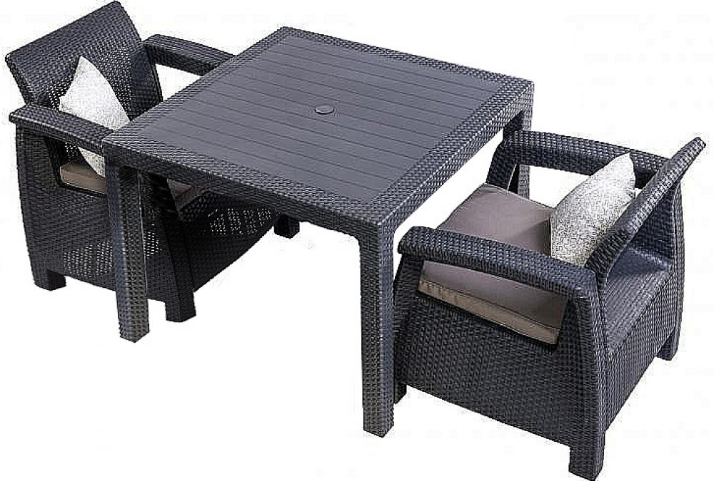 Sestava obsahuje: 1x Zahradní stůl z umělého ratanu MANHATTAN 95x95 cm (antracit), 1x Zahradní ratanová sestava CORFU DUO (antracit)