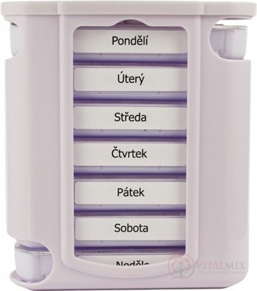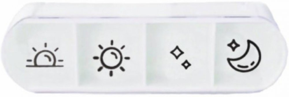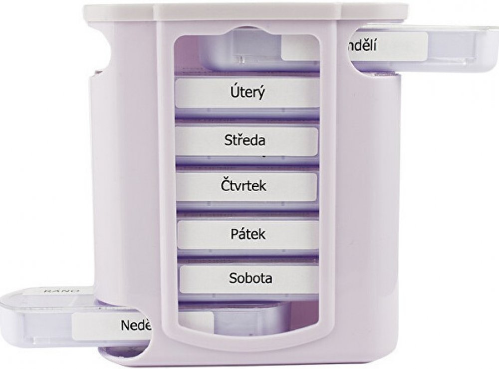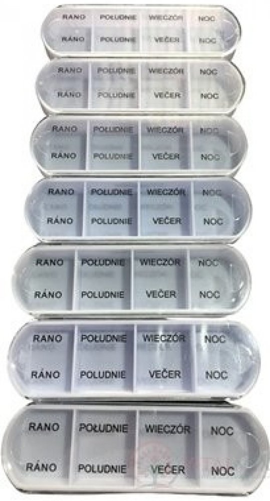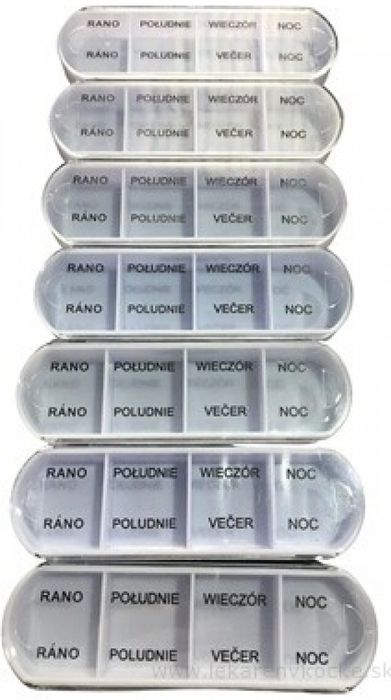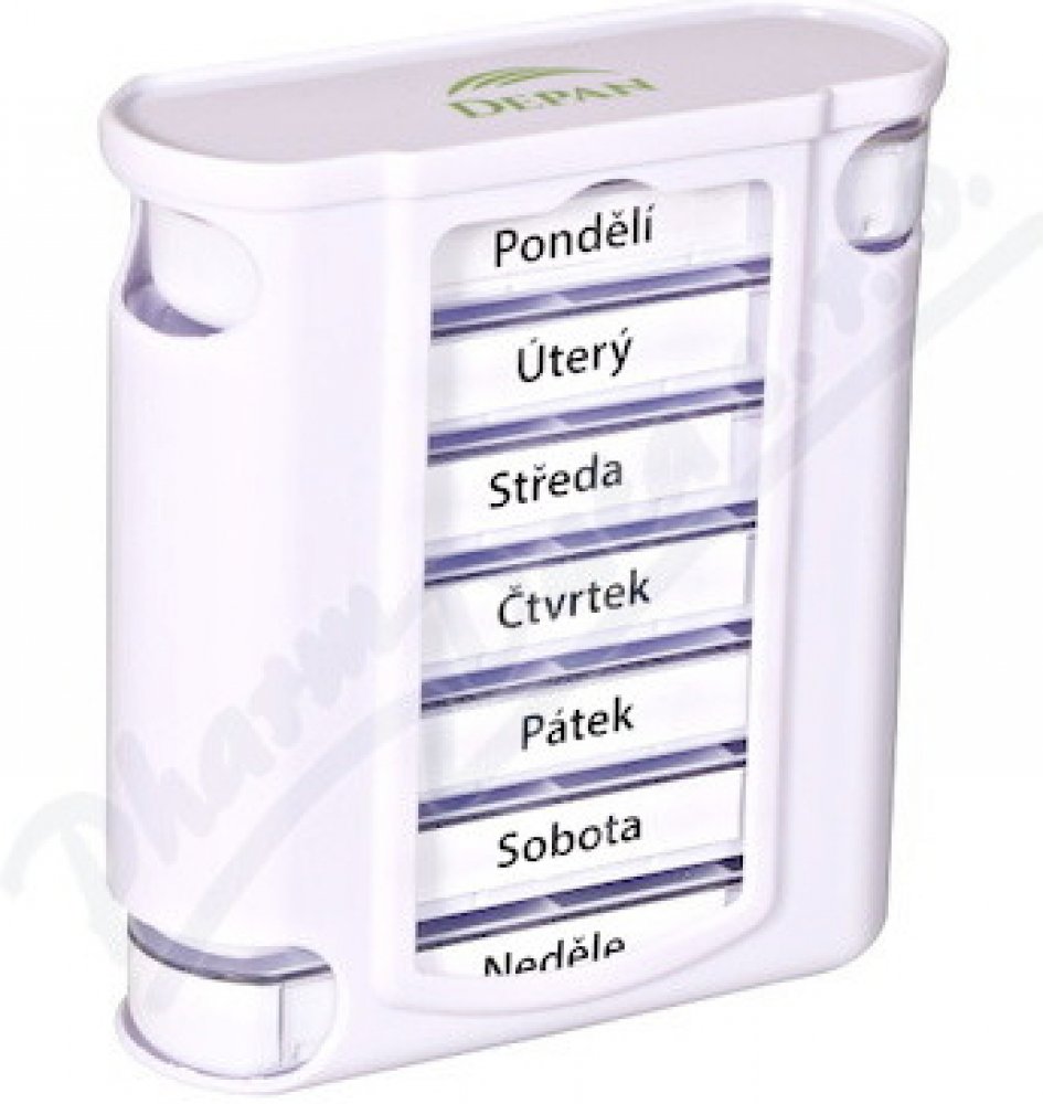 DEPAN Patrový dávkovač léků se zásuvnými políčky pro každý den v týdnu, přehledně popsaný pro snadnou orientaci. Denní dávkovač je rozdělený na 4 části: Ráno-Poledne-Večer-Noc a lze jej použít i samostatně. Dávkovač slouží k přehlednému uspořádání léků či potravinových doplňků doma i na cestách.
