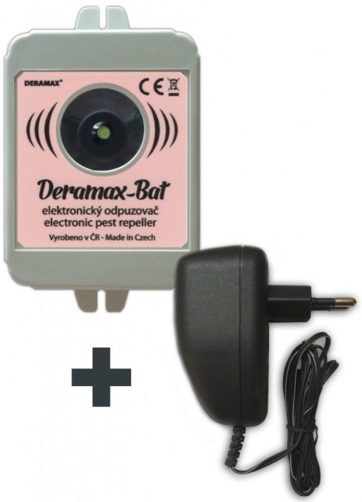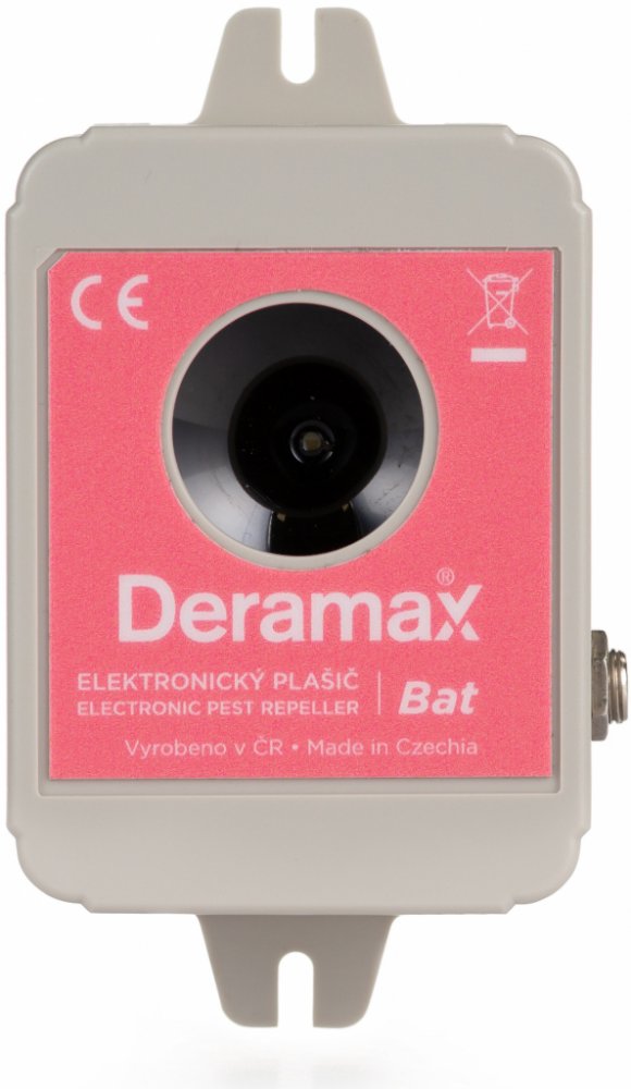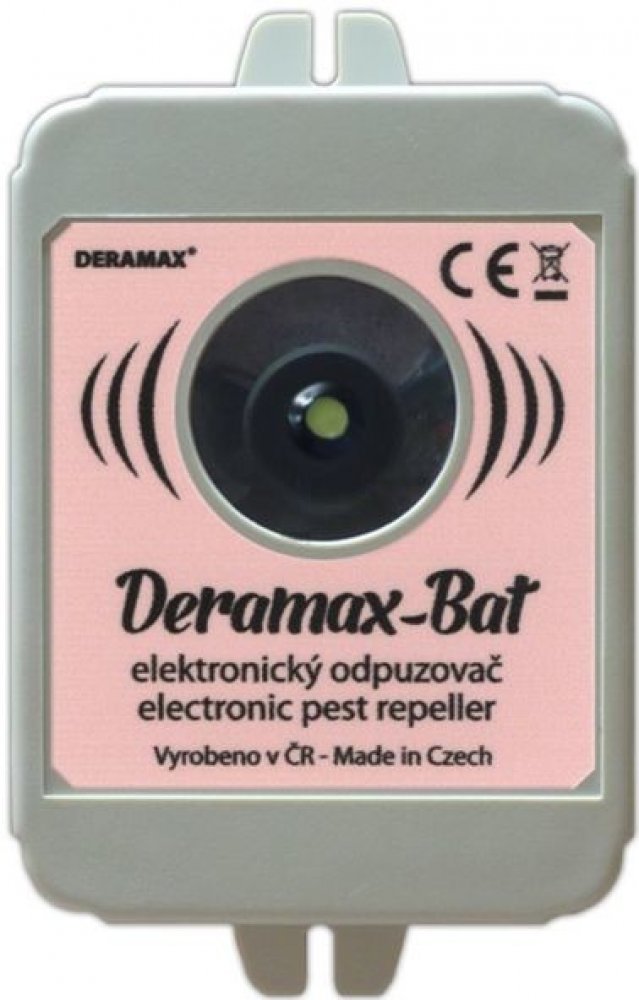 Instalace a rozsah účinnosti plašiče Deramax-Bat: Instalace odpuzovače-plašiče netopýrů spočívá pouze v jeho umístění do prostoru určeného k ochraně a připojení napájecího zdroje, jinak pracuje zcela automaticky a není potřeba žádné nastavovanie.Rozsah účinnosti tohoto odpuzovače-plašiče netopýrů, je při použití ve vnitřních prostorách podle členitosti prostor až do 500m2.Pri použití ve venkovních prostorách je dosah až 21metrů v úhlu cca 90stupňov.Pozn.Díky speciální konstrukci odpuzovače je úhel záběru vyzařovaného signálu ve vzdálenosti několika metrů od přístroje rozšířen až na 180stupňů.Ultrazvukový odpuzovač netopýrů Deramax-Bat lze použít ve vnitřních i venkovních priestoroch.Zariadenie je odolné vůči vlhkosti, avšak v případě využití ve venkovních prostorách je bezpodmínečně nutné chránit přístroj před přímým vlivem deště a snehu.Technické údaje odpudzova e-plašiče Deramax-Bat: Napájení: Externí síťový stabilizovaný zdroj 12V ss. (Není součástí dodávky) Průměrný příkon: 2W (náklady na měsíční provoz = cca 10Kč) Dosah ve venkovních prostorách: až 21metrů. Úhel záběru 90stupňů (180stupňů) Okolní teplota: -20st.C až 60st.CRozmery: 105x60x40mm (s montážními úchyty) Hmotnost: 0,068kgVyrobené v ČR! Proč koupit právě odpuzovač-plašič netopýrů Deramax-Bat? Deramax-Bat je kvalitní ultrazvukový odpuzovač netopýrů , který generuje intenzivní ultrazvukové signály se specifickým tvarem a rozsahem frekvencií.Jedná se o výkonné zařízení určené k vymezení pohybu netopýrů v rámci chráněného priestoru.Jedná se skutečně o Český produkt? Odpuzovač-plašič Deramax-Bat je vyráběn ve shodě s normou ČSN EN ISO 9001: 2001 a to fyzicky na území SR.Výroba odpuzovače Deramax-Bat je řešena také s ohledem na životní prostředí a možnost jednoduché recyklácie.Súčasťou prohlášení o shodě je také deklarace RoHS kompatibility, kterou dodržujeme a která vylučuje použití olovnatých a jiných toxických materiálů.
