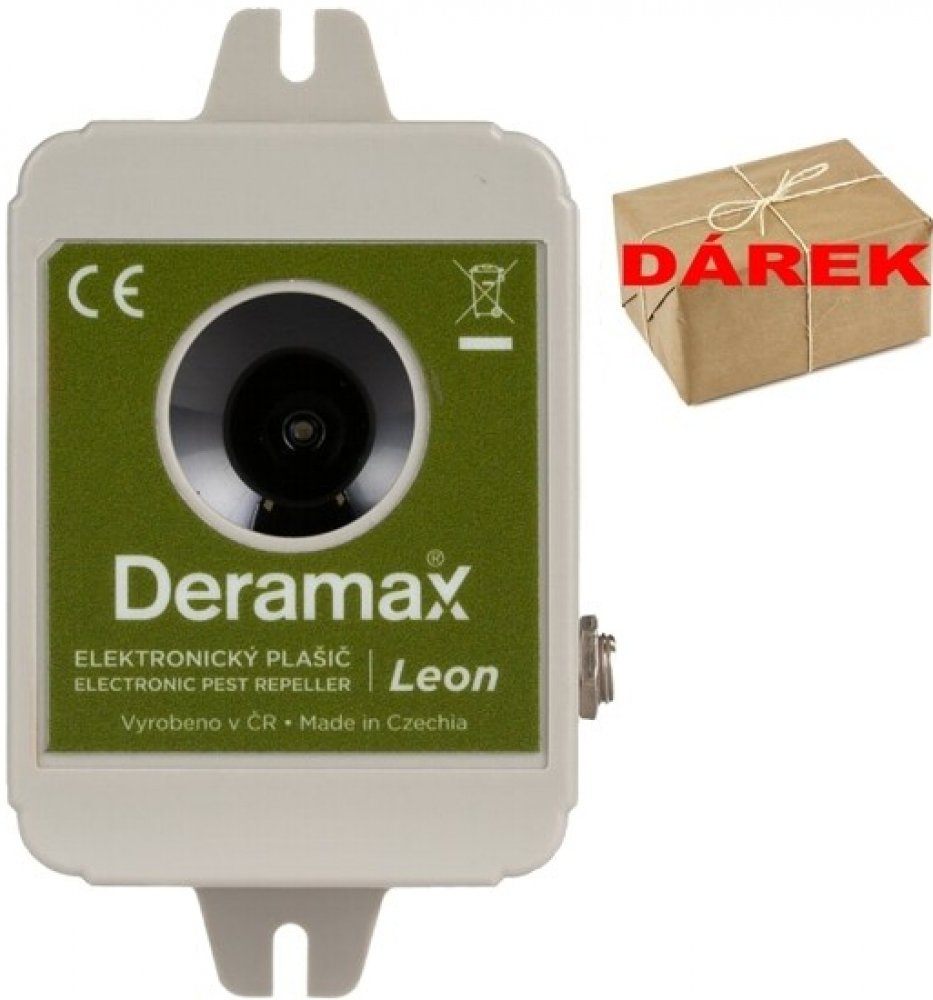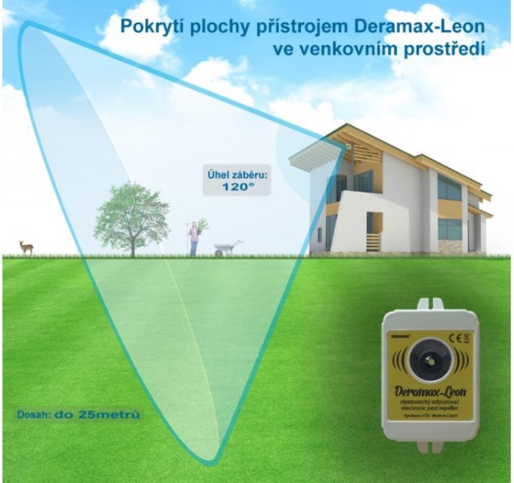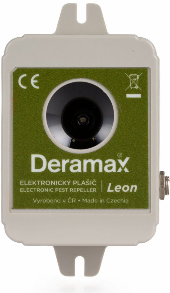 Deramax-Leon je kvalitní ultrazvukový odpuzovač srnčí, jelení, dančí zvěře, divokých prasat, lišek, jezevců, zajíců apod. který generuje intenzivní ultrazvukové signály se specifickým tvarem a rozsahem kmitočtů. Jedná se o výkonné zařízení určené k vymezení pohybu divoké zvěře v rámci chráněného prostoru.