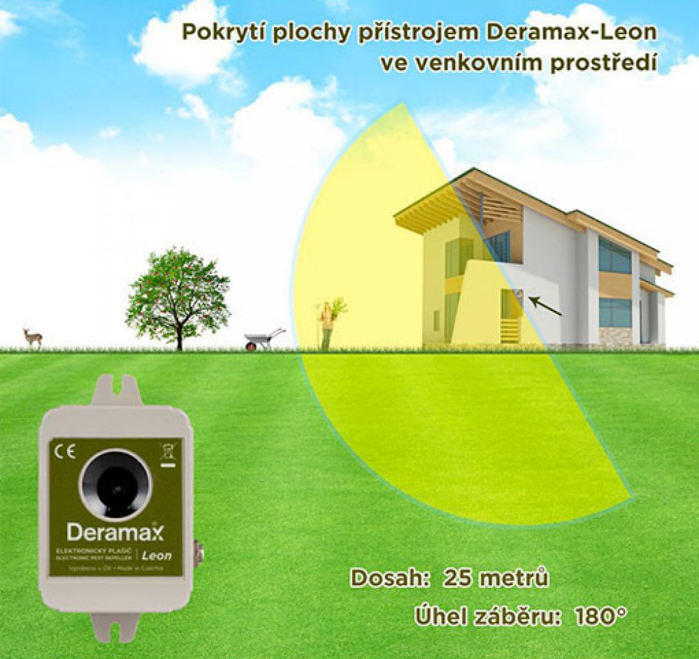Deramax-Leon je určený pro ochranu vnitřních i venkovních prostor. Odpuzovač divokou zvěř nezabíjí, ani nezraňuje, pouze vymezuje prostor ve kterém by se neměla pohybovat.