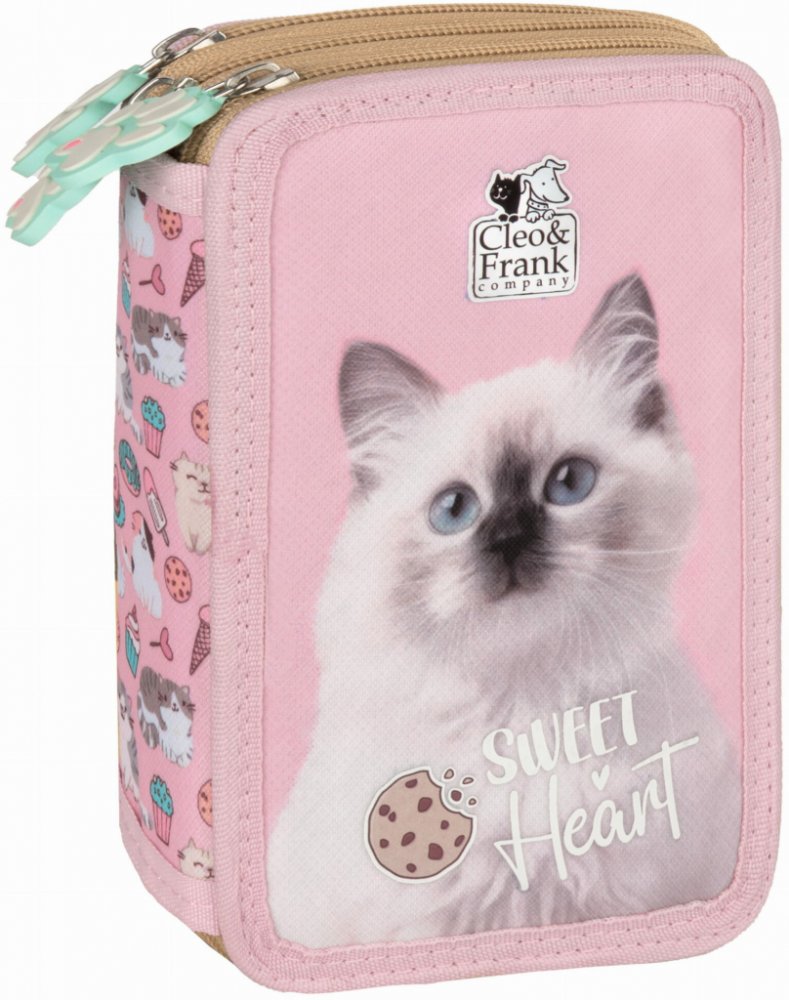Školní třípatrové pouzdro s motivem kočky z kolekce Cleo a Frank obsahuje kompletní vybavení: 18 ks pastelky, 18 ks fixy, propisku, tužku 1 ks, ořezávátko, pravítko, gumu. Rozměry: cca 20 x 13 x 7cm, hmotnost: 465 g. Oboustranný potisk, materiál: 100% polyester, pevná látka. Penál má dekorativní potisk nejen na vnější straně, ale i na vybraných prvcích výbavy. Originální produkt, vhodný pro děti od 3 let, pro školáky.