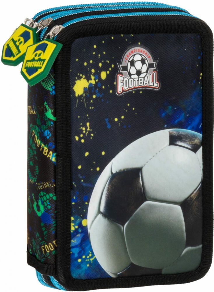 Školní třípatrové pouzdro s motivem fotbal obsahuje kompletní vybavení: 18 ks pastelky, 18 ks fixy, propisku, tužku 1 ks, ořezávátko, pravítko, gumu. Rozměry: cca 20 x 13 x 7cm, hmotnost: 465 g. Oboustranný potisk, materiál: 100% polyester, pevná látka. Penál má dekorativní potisk nejen na vnější straně, ale i na vybraných prvcích výbavy. Penál je vhodný pro děti starší 3 let, pro školáky.