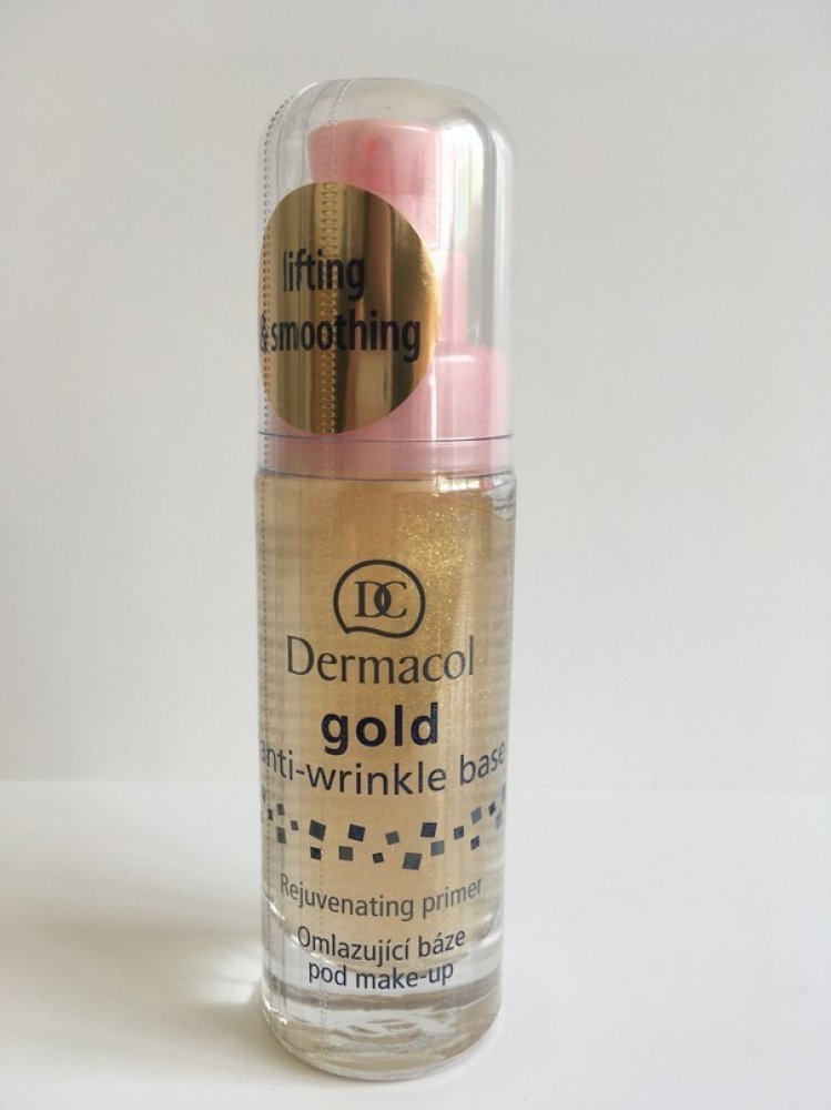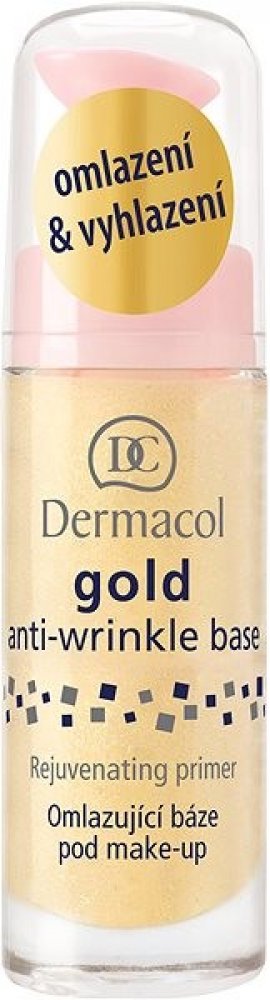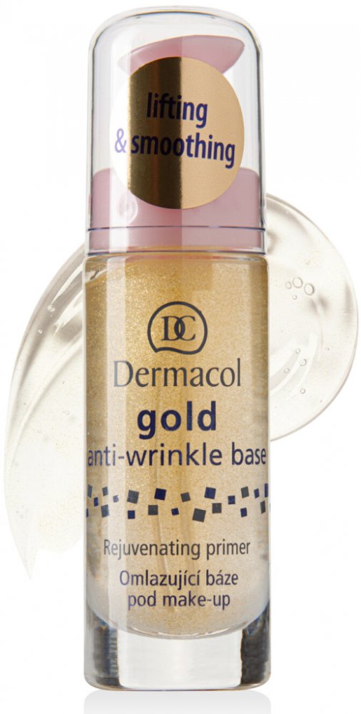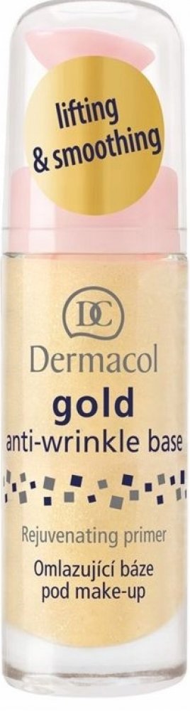 Dermacol Gold anti-wrinkle make-up base je omlazující báze pod make-up se zlatými třpytkami a mořskými řasami vyplňuje vrásky, vyhlazuje pleť a dodává pokožce pružnost a jas. Má omlazující a antioxidační účinky. Výsledkem používaní je viditelně omlazená a vyhlazená pleť, připravená na aplikaci make-upu. Ten se nebude během dne usazovat v pórech a vráskách. Pleť bude působit mladistvým, pěstěným dojmem.Báze zabraňuje usazování make-upu.Fixuje vaše líčení a zvyšuje jeho odolnost.Zpomaluje proces stárnutí díky výtažku z mořské řasy.Pro všechny typy pleti.Balení obsahuje 20 ml.