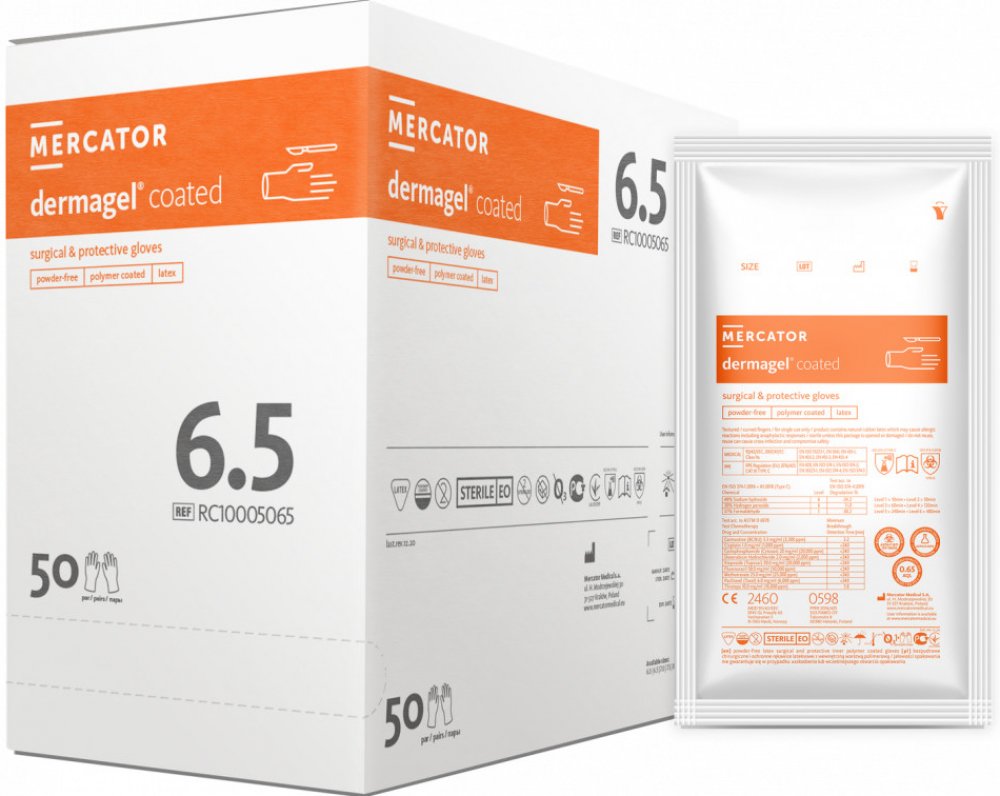 Zdravotnické rukavice operační – latexové (pudrované) – jednorázové latexové operační rukavice sterilní (pudrované), anatomický tvar pravé a levé ruky. Rukavice Dermagel jsou pružné a odolné proti roztržení, které zajišťují dokonalý úchop. Vnitřní polymerová vrstva umožňuje snadné nasazení na suché a vlhké ruce. Velikosti 6,0 – 9,0. Zdravotnický prostředek (ZP) třídy IIa.