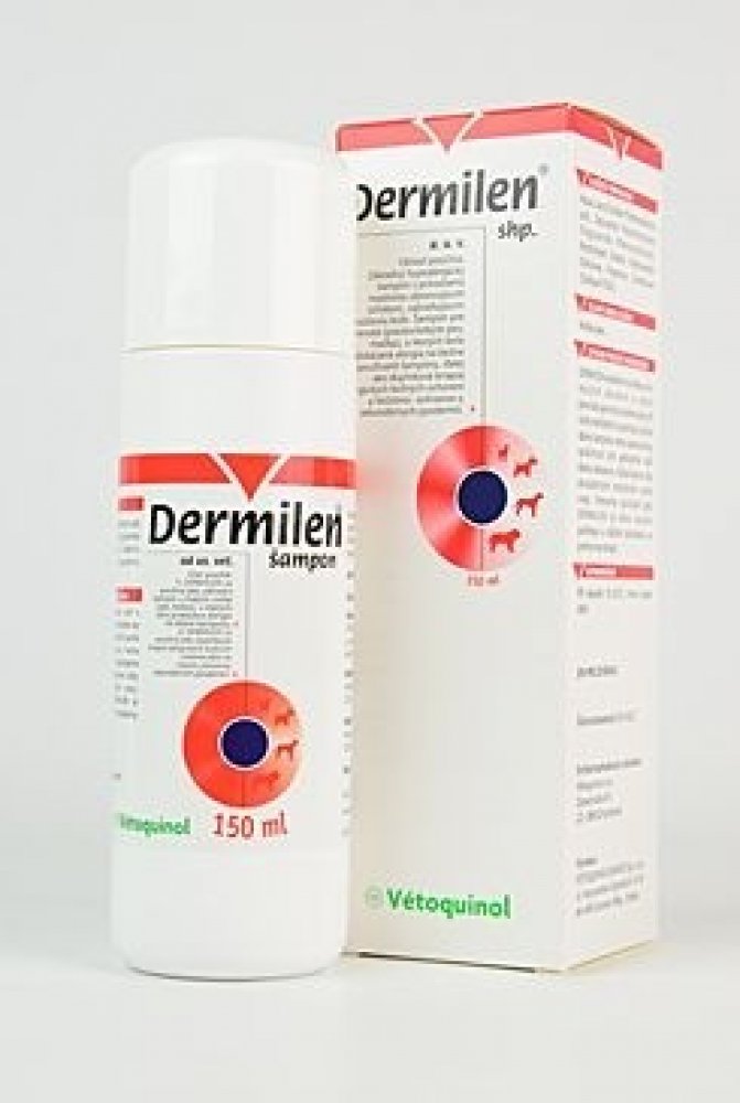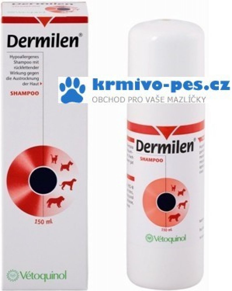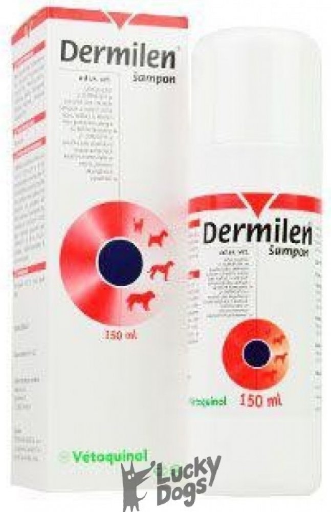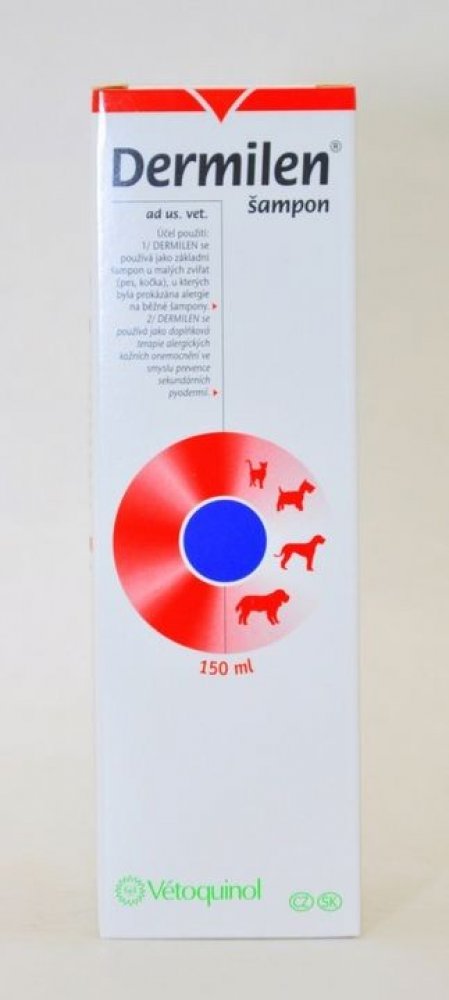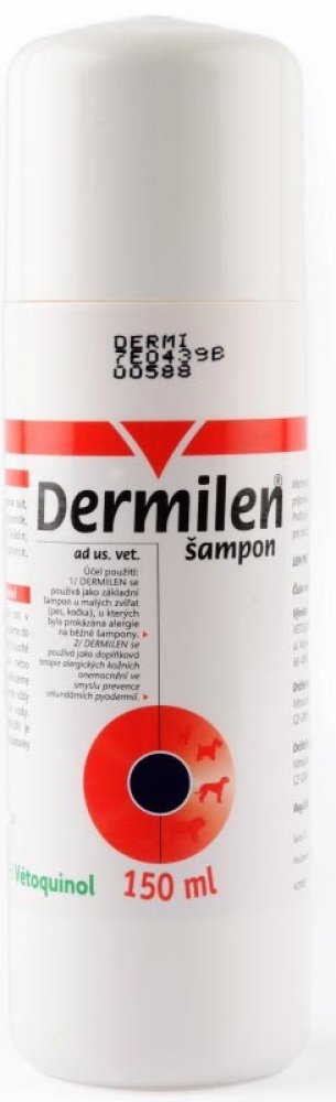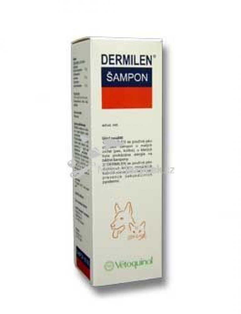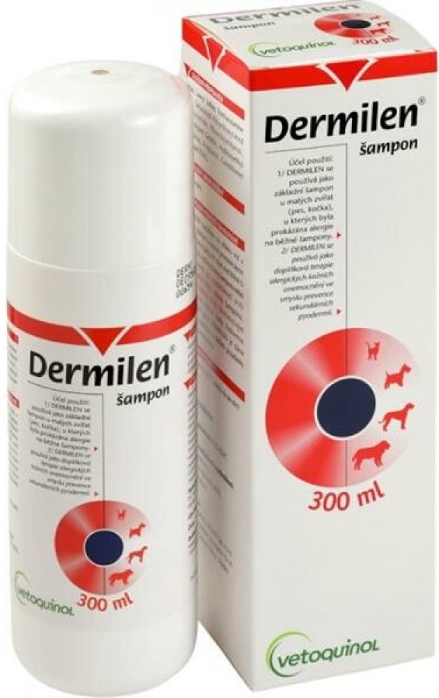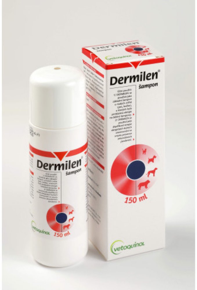Použití šamponu Dermilen: Jako základní šampón u psů a koček, u kterých byla prokázána alergie na běžné šampóny, jako doplňková terapie ve smyslu prevence sekundárních kožních onemocnění. Hypoalergenní gelový šampón pro psy a kočky se silným čistícím efektem, zabraňuje nežádoucímu vysoušení kůže a udržuje kůži a srst hebkou, pružnou a lesklou. Doporučeno v případě citlivosti na běžné šampóny, u zvířat s vysoce citlivou a suchou kůží a v případě časté frekvence používání šampónu. Používá se také jako doplňková terapie alergických kožních onemocnění.